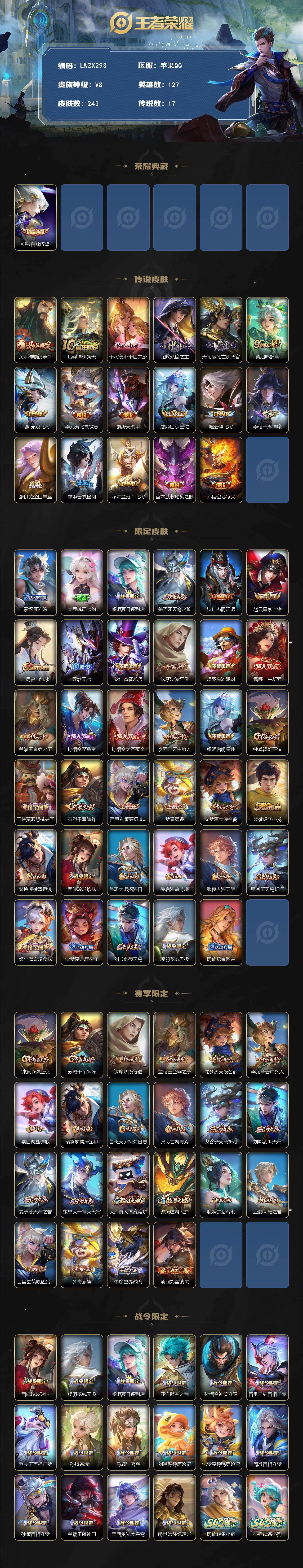 【特价出售/店主推荐】苹果Q-V8-最强王者段位-127英雄-243皮肤-1典藏皮肤-17传说-61史诗-3【英雄全皮】:孙权全皮,敖隐全皮,影全皮【荣耀典藏】:铠银白咏叹调【传说皮肤】:关羽神骥镇沧海,后羿神树通天,干将莫邪千山共赴,元歌诡秘之主,大司命死亡执政官,桑启鸣野蒿,马超无双飞将,李元芳飞鸢探春,铠绛天战甲,虞姬启明星使,曜云鹰飞将,李信一念神魔,张良黄金白羊座,虞姬云霓雀翎,花木兰冠军飞将,宫本武藏地狱之眼,孙悟空地狱火【限定皮肤】:蒙犽顽岩魄,大乔绒语心约,虞姬夏日便利店,姜子牙