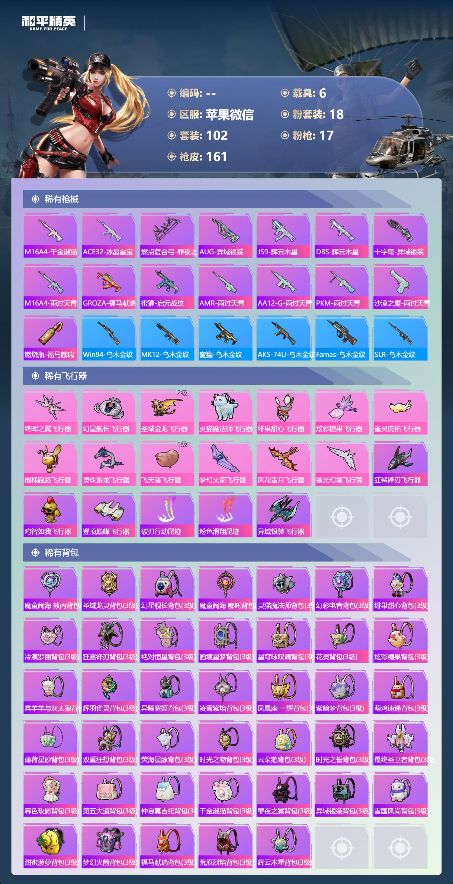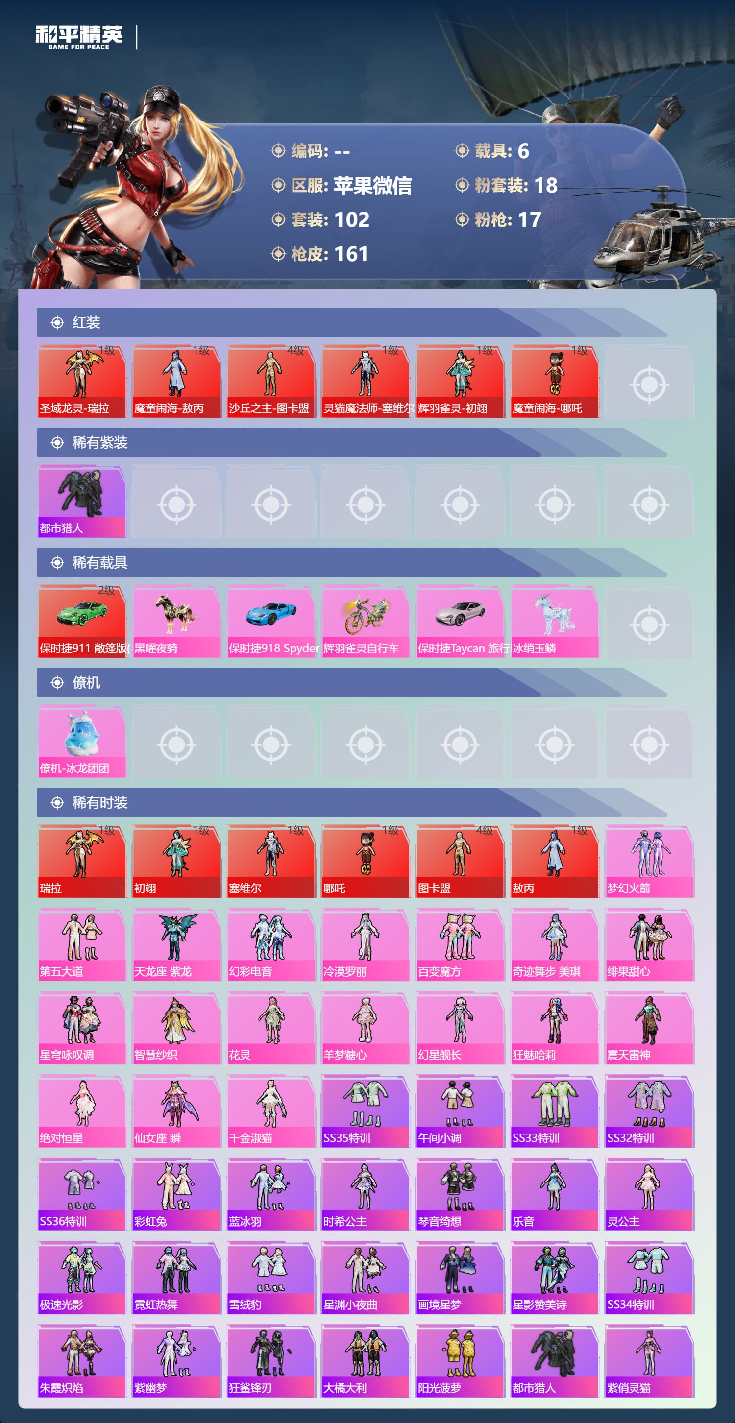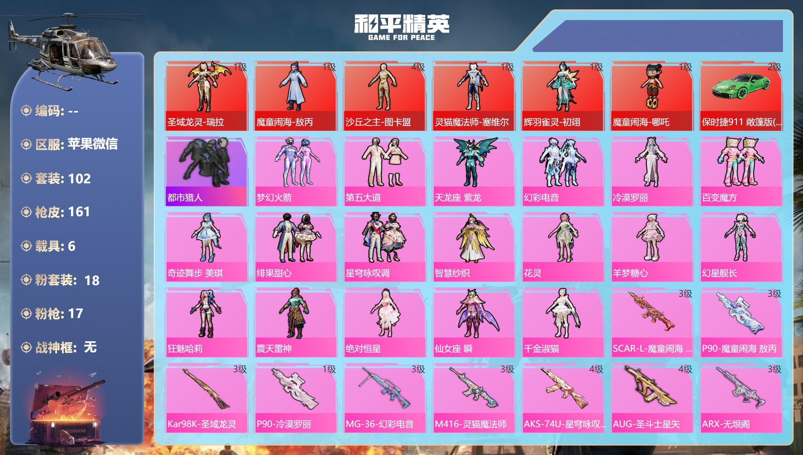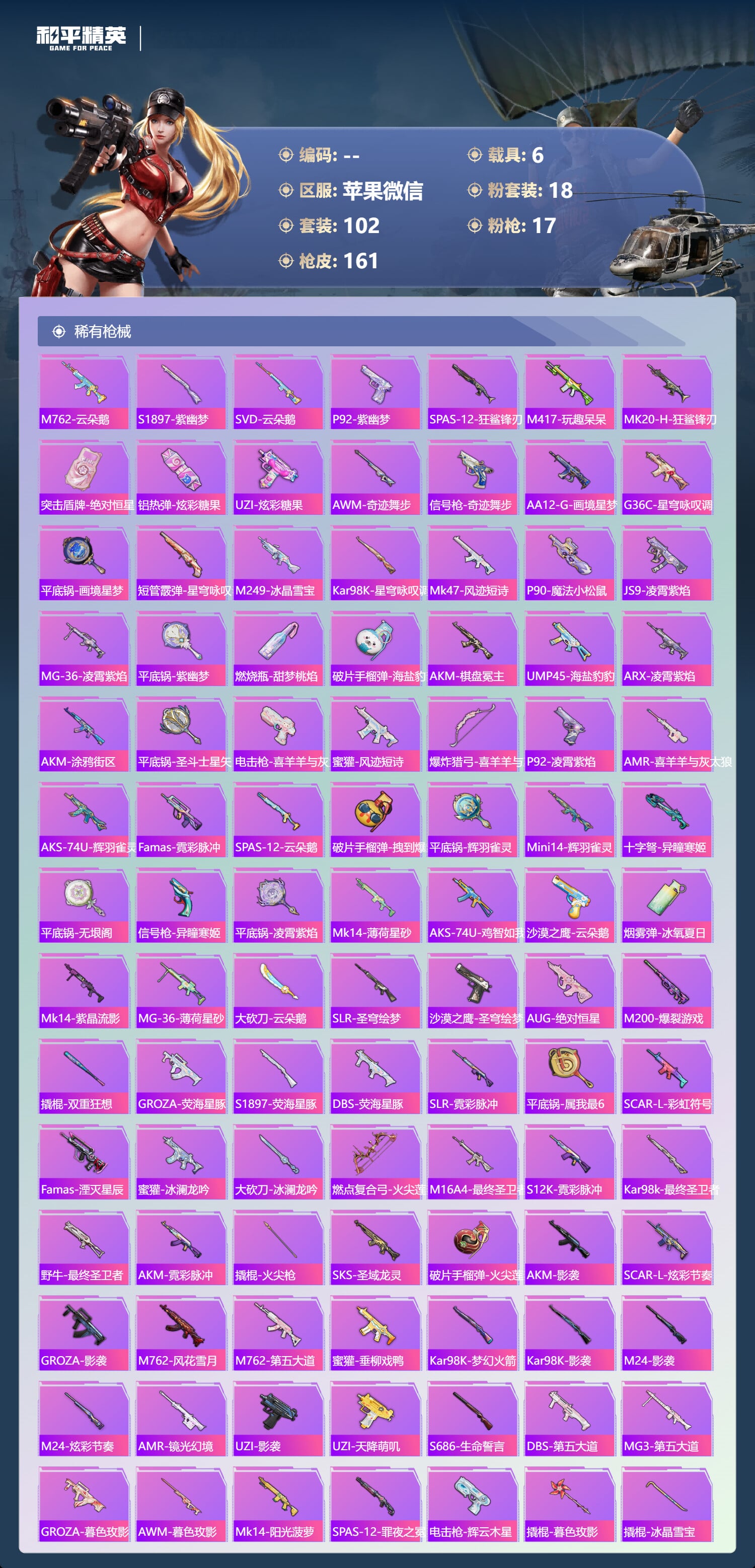 a4313/苹果微/6王牌印记-6红装-18粉装-17特效枪-6载具-79334热力值-102套装