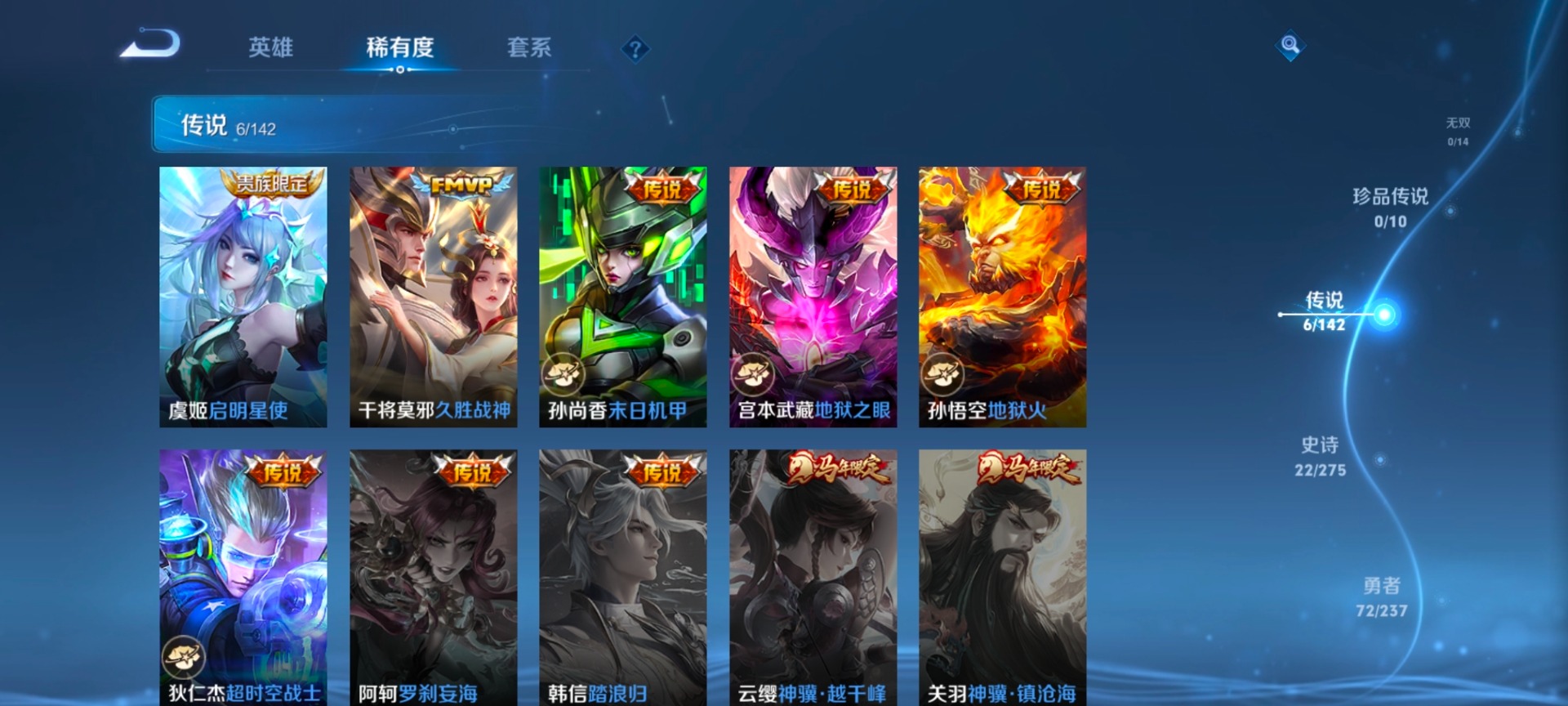 【稀有英雄】大司命,韩信(韩跳跳),夏洛特(夏师傅),艾琳,橘右京(橘子),娜可露露(鸟人),不知火舞,赵云,金蝉(唐僧),戈娅