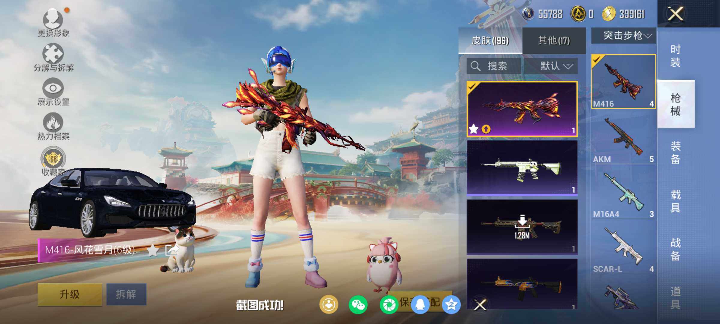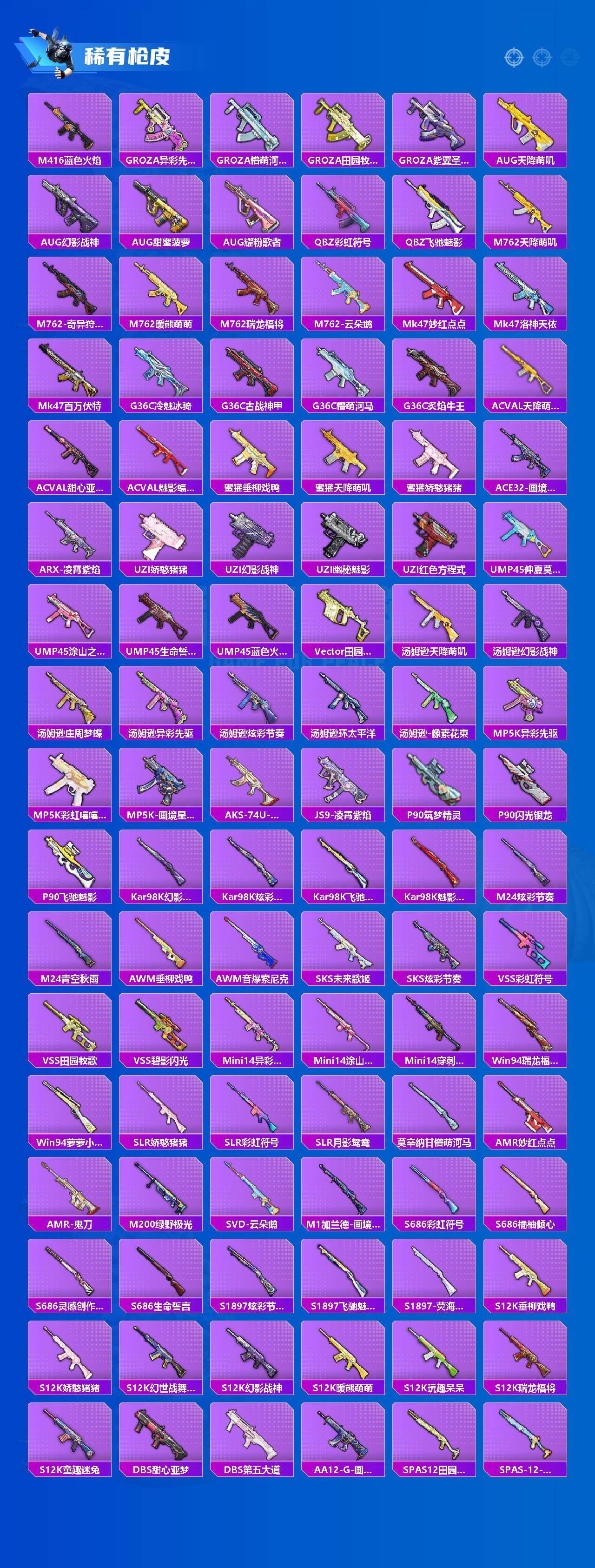 【粉色枪皮等级】:SCAR-L-纯梦嫁纱(六级),M416-风花雪月(六级),UMP45-萌骑冒险(二级),AKS-74U