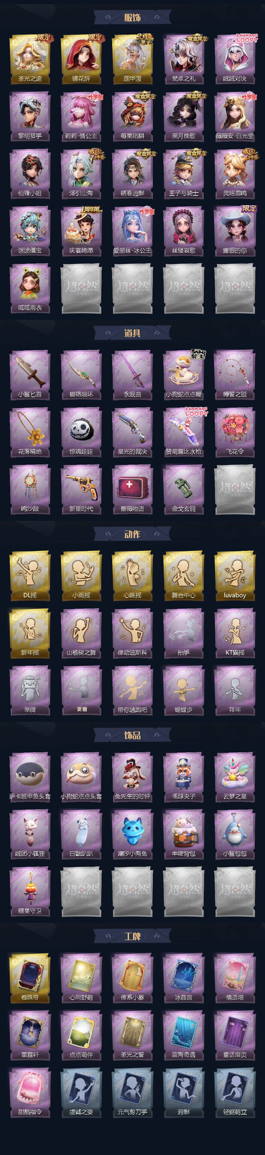 薇薇安-圣光之谕,巫铃儿-镜花辞,逍遥-莲华渡,爱德华-梵卓之礼,艾伦-绒绒对决,艾伦-黎明猎手,莉莉-情公主,莉莉-莓果陷阱,薇薇安-黑月挽歌,薇薇安-白光莹,薇薇安-仙锋小姐,逍遥-泽引山海,逍遥-绣春逍影,阿念-王子与骑士,阿念-灵昭鹿鸣,阿念-迷途僵宝,阿念-庆宴绮愿,爱丽丝-冰公主,爱丽丝-丝缕哀歌,爱丽丝-耀眼的你,小黄-呱呱雨衣,刺刀-小鲨匕首,刺刀-碧络琅环,桃木剑-永眠曲,长鞭-小狗蛇点点鞭,长鞭-缚誓之锁,摸金符-花落精绝,腰包-惊魂娃娃,短管猎枪-星光的裁决,短管猎枪-赞萌