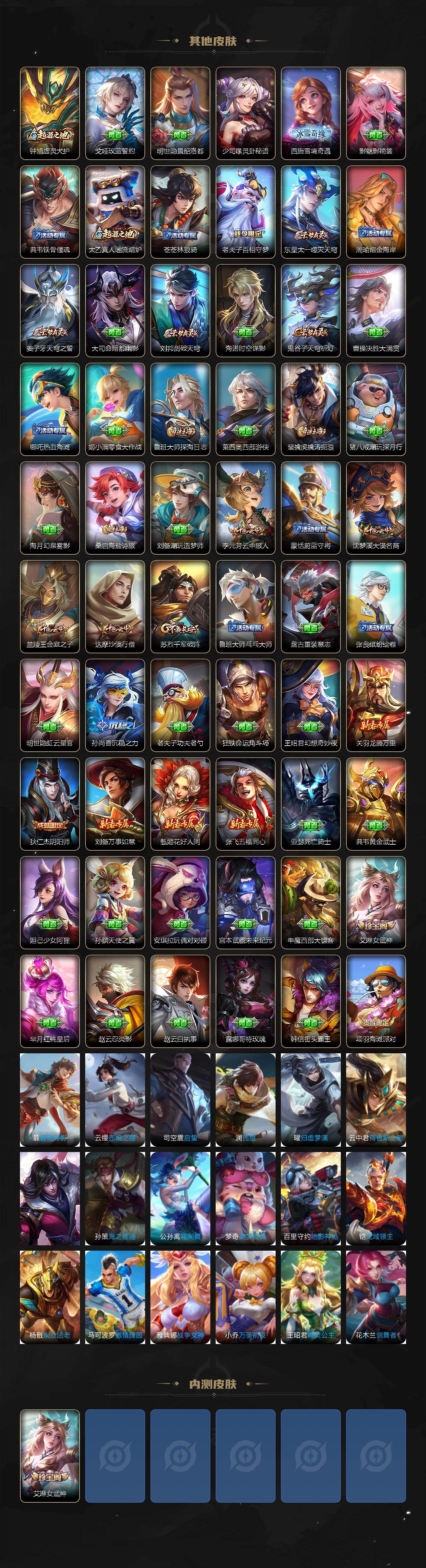 【限定皮肤】:姜子牙天穹之誓,狄仁杰阴阳师,赵云皇家上将,元歌无心,达摩沙漠行僧,项羽海滩派对,兰陵王金庭之子,李元芳云中旅人,