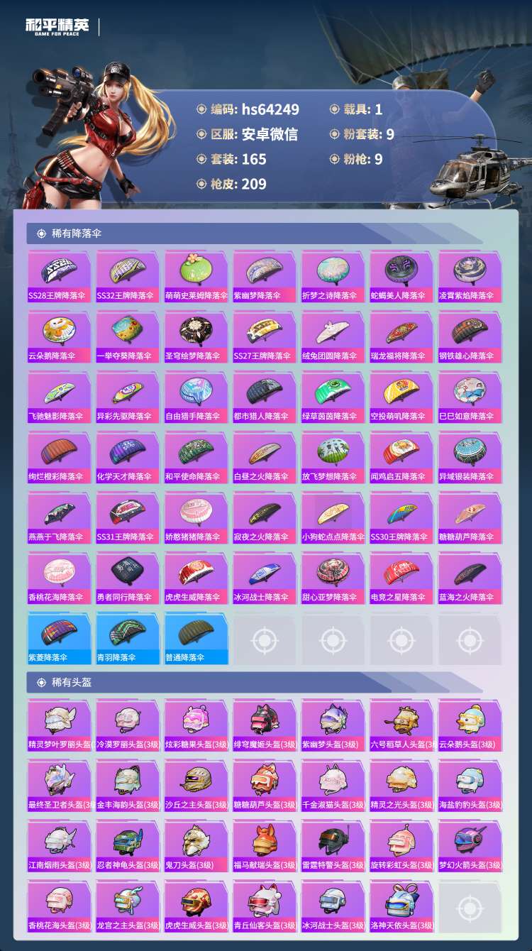 hs64249 苹果微-6王牌印记-9粉装-9特效枪-1载具-63232热力值-165套装-209