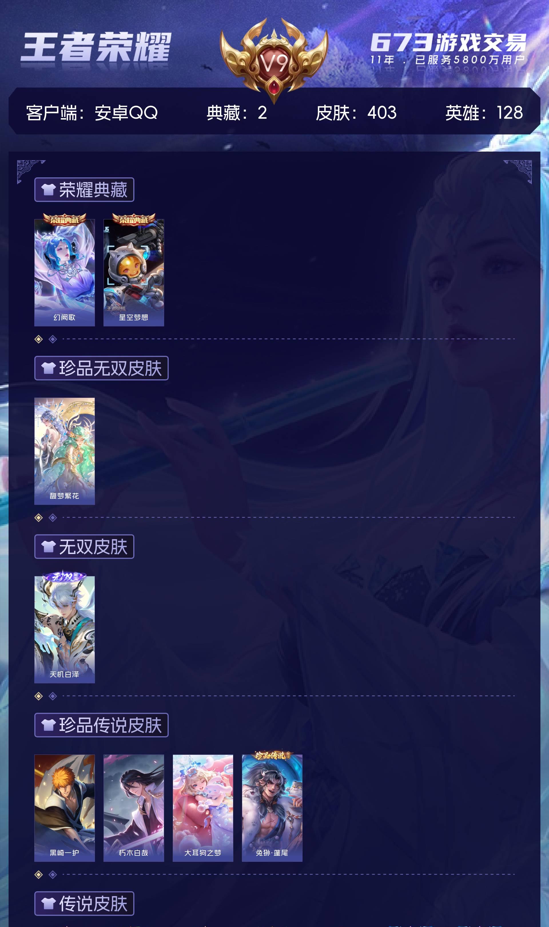 V9 皮肤403 英雄128 非凡王者 荣耀典藏2 珍品无双1 无双皮肤1 珍品传说4 传说35 其他皮肤367