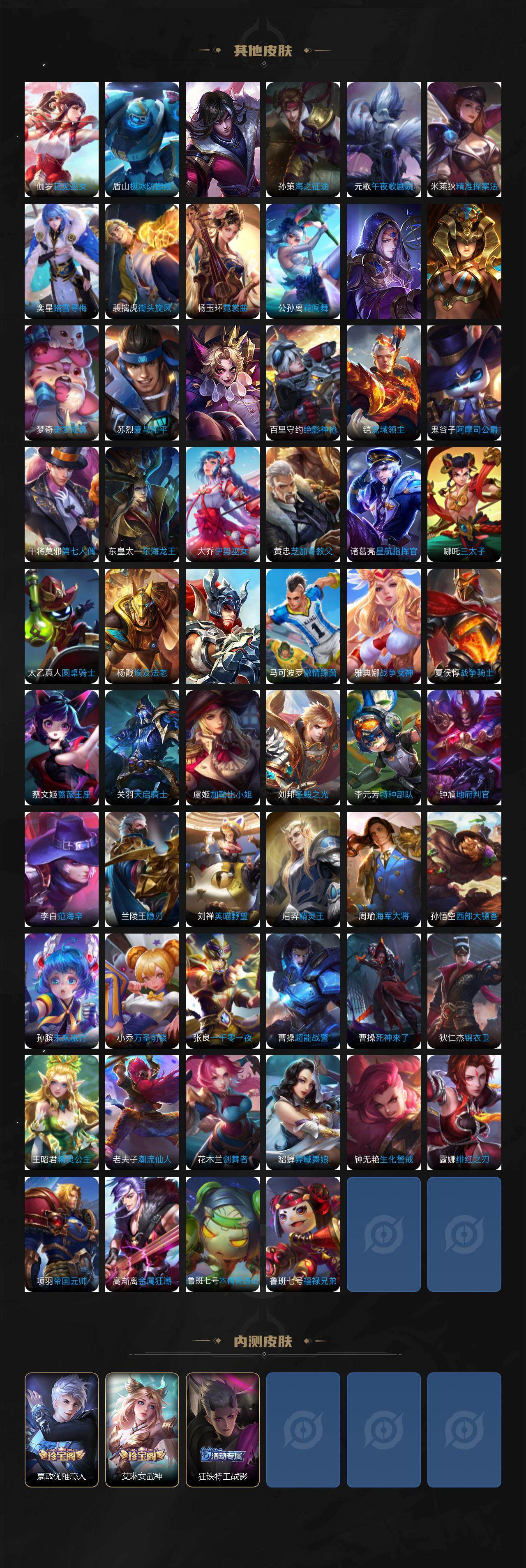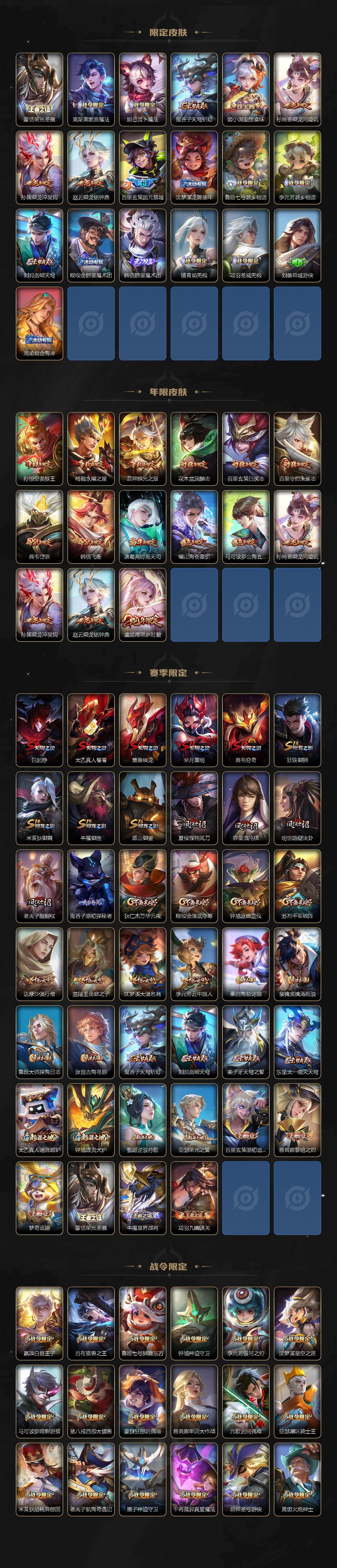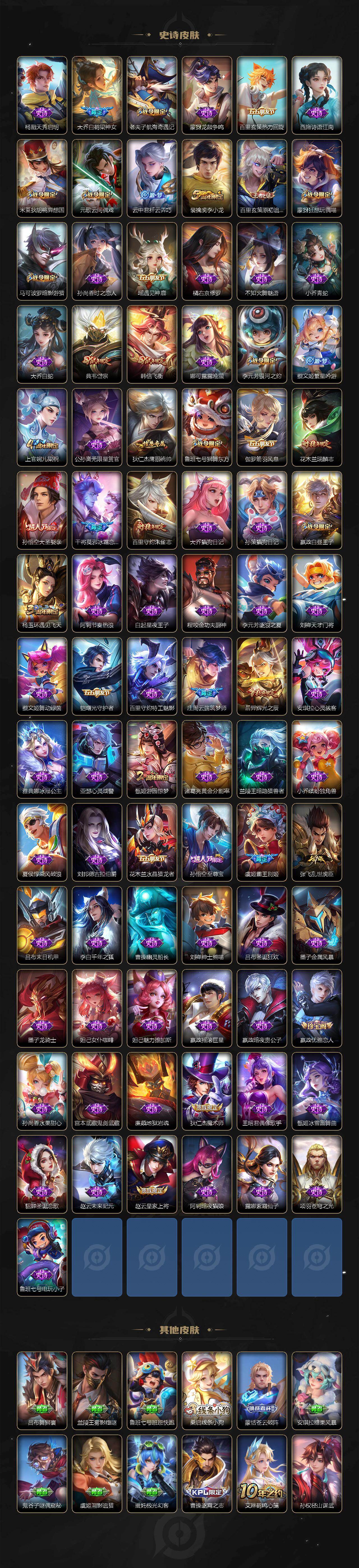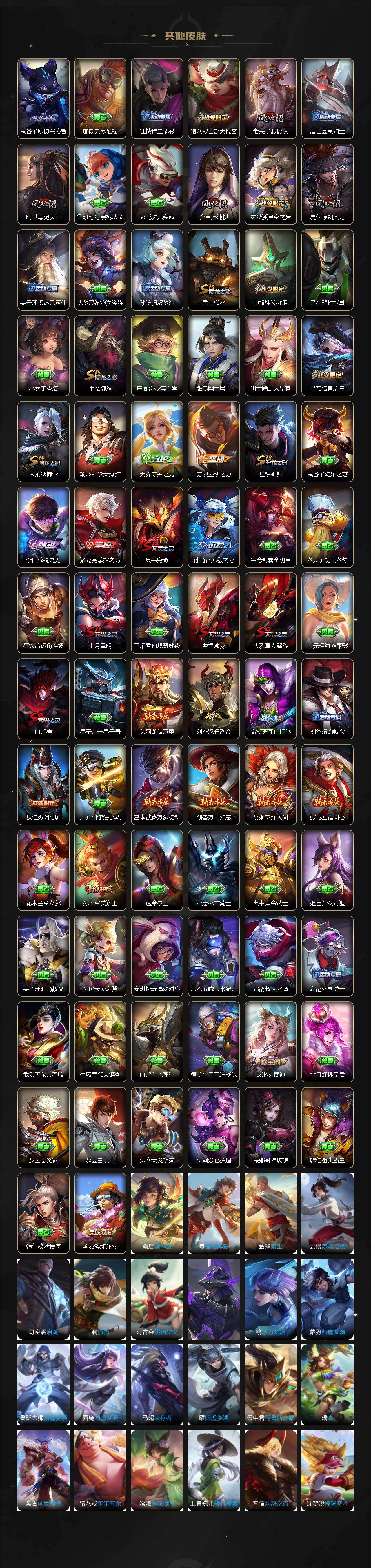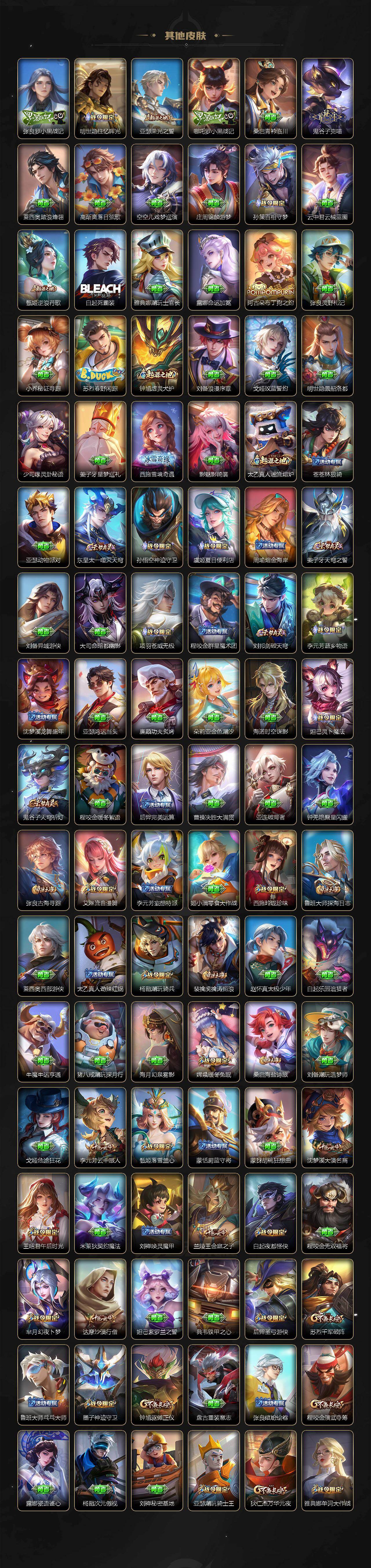 【英雄全皮】:孙权全皮,娜可露露全皮,橘右京全皮,钟馗全皮,鬼谷子全皮,百里玄策全皮,狂铁全皮,猪八戒全皮,敖隐全皮,蒙恬全皮,金蝉全皮,暃全皮,戈娅全皮,空空儿全皮,影全皮