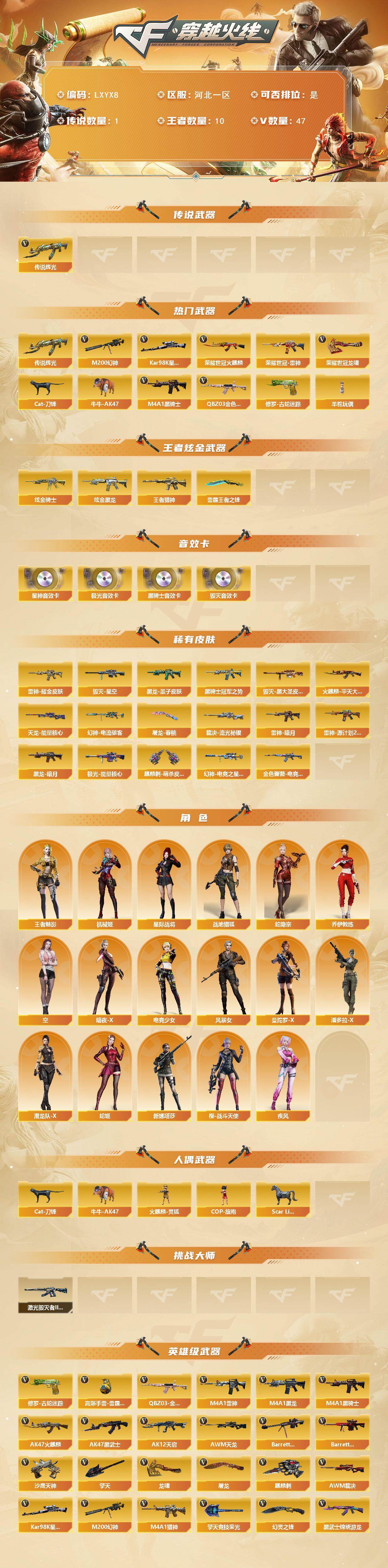 【LXYX8】42V/95级/将帅/1传说/10王者/2炫金/5英雄/传说辉光/QBZ03-金色蔷薇/M200-幻神/修罗-古蛇迷踪/火麒麟-荣耀世冠/雷神-荣耀世冠/Kar98k-星神/Cat-刀锋/牛牛-AK47/M4A1-黑骑士/羊驼玩偶/龙啸-荣耀世冠/王者猎神/雷霆王者之锋/炫金黑骑士/炫金黑龙/M4A1-黑骑士音效卡/Barrett-毁灭音效卡/Barrett-极光音效卡/星神音效卡/幻神-电流骇客/幻神-电竞之星 皮肤/金色蔷薇-电竞之星 皮肤/裁决-流光秘银/雷神-暗月/雷神-耀