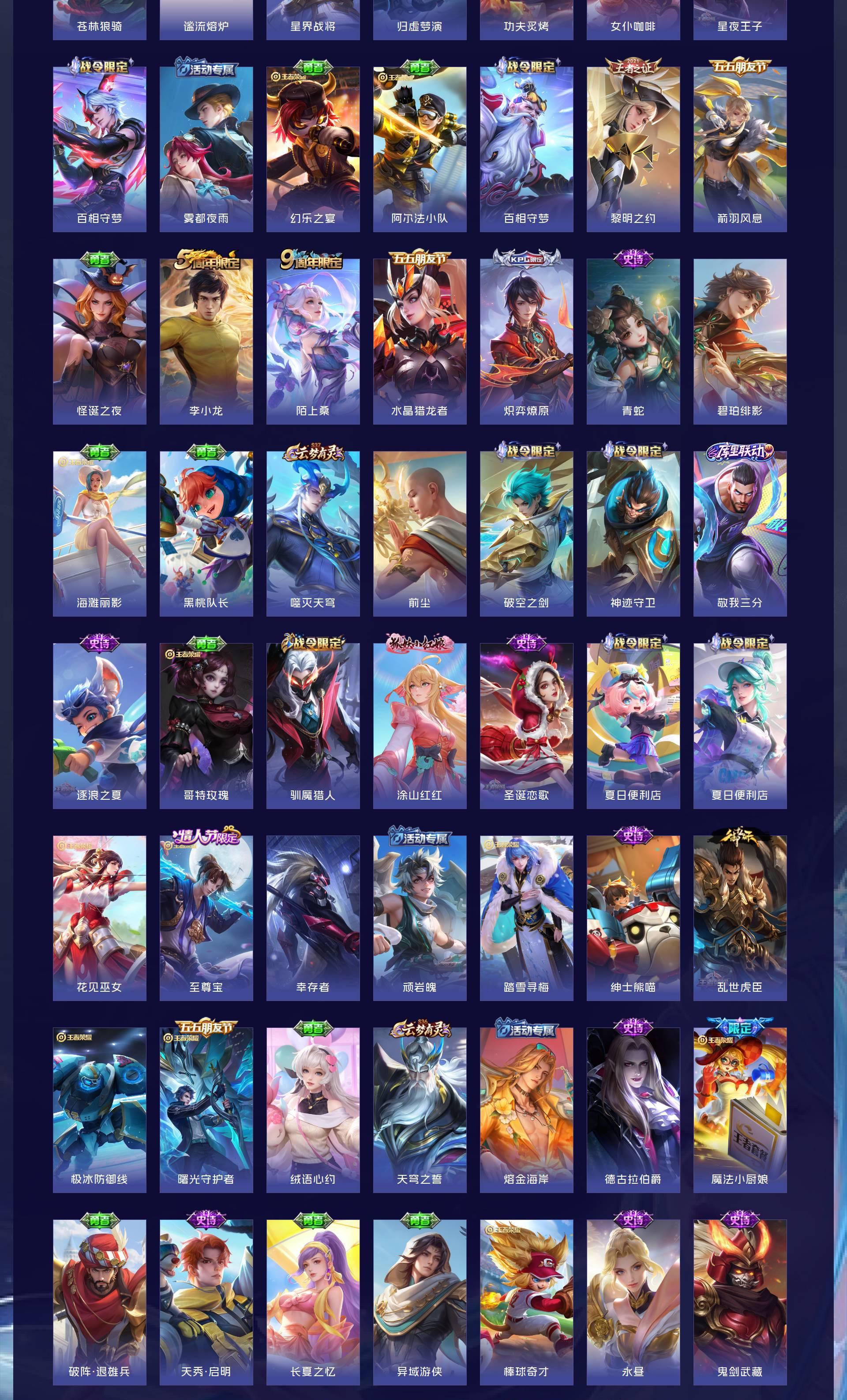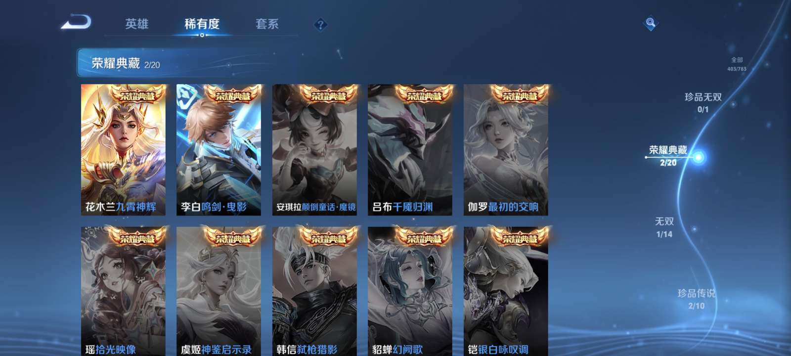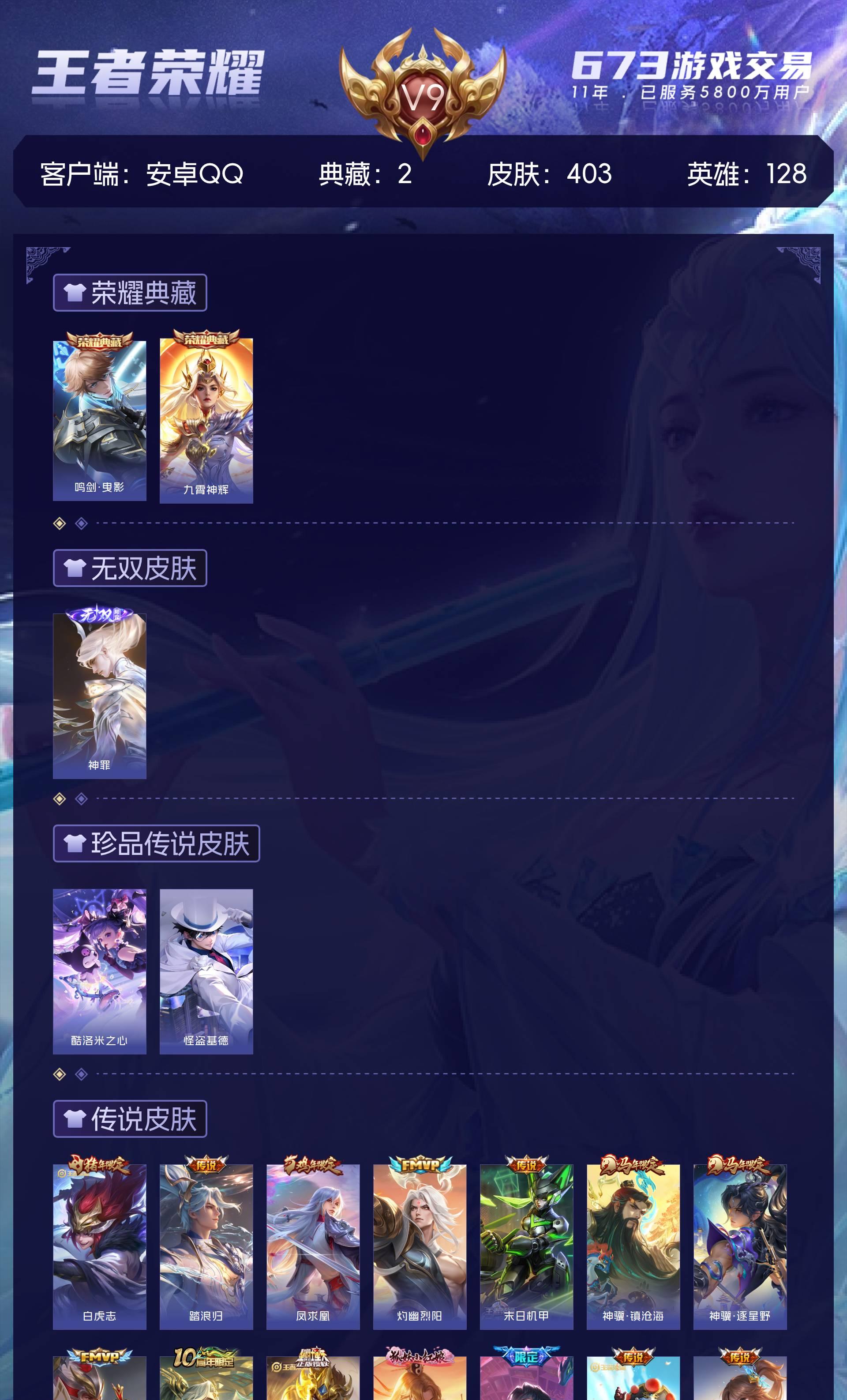 V9 皮肤403 英雄128 最强王者 荣耀典藏2 无双皮肤1 珍品传说2 传说42 其他皮肤362