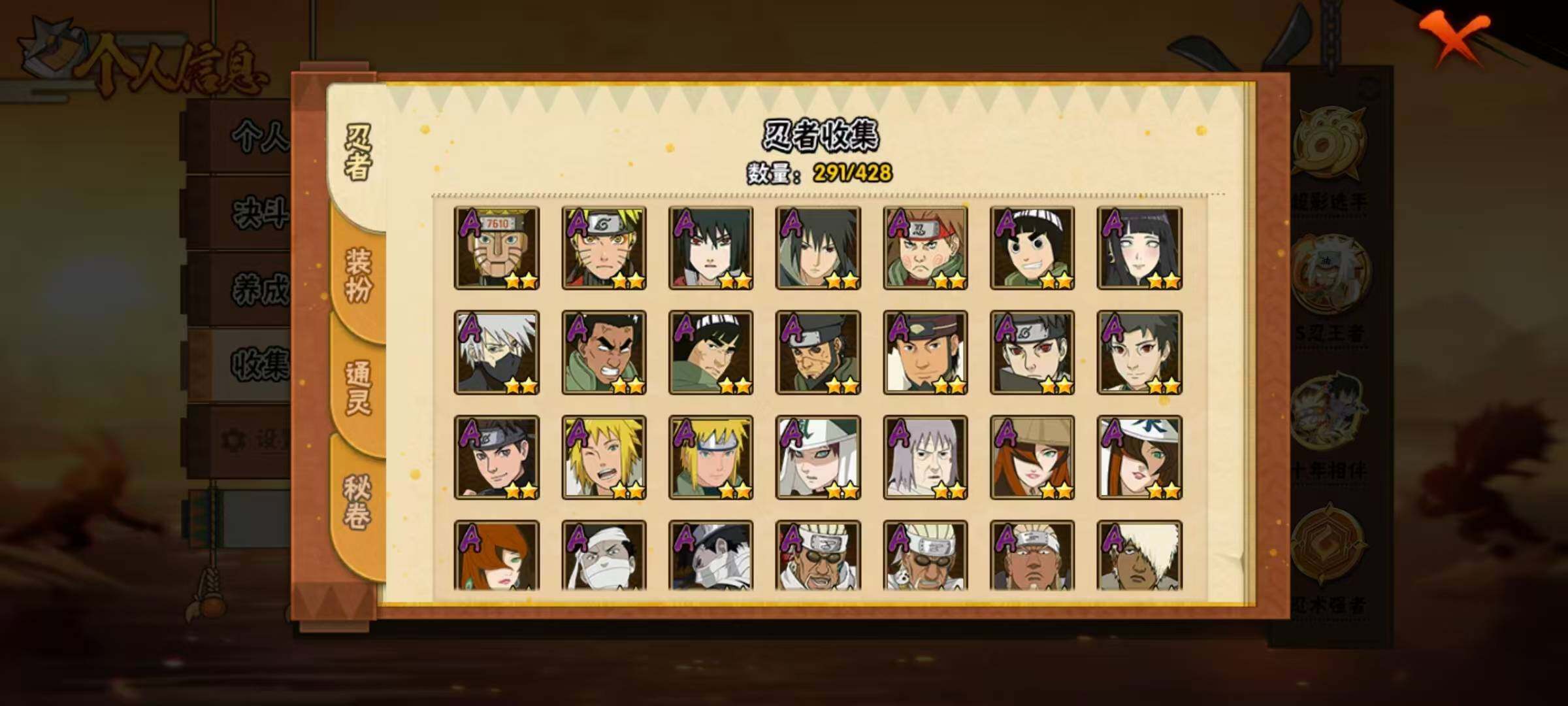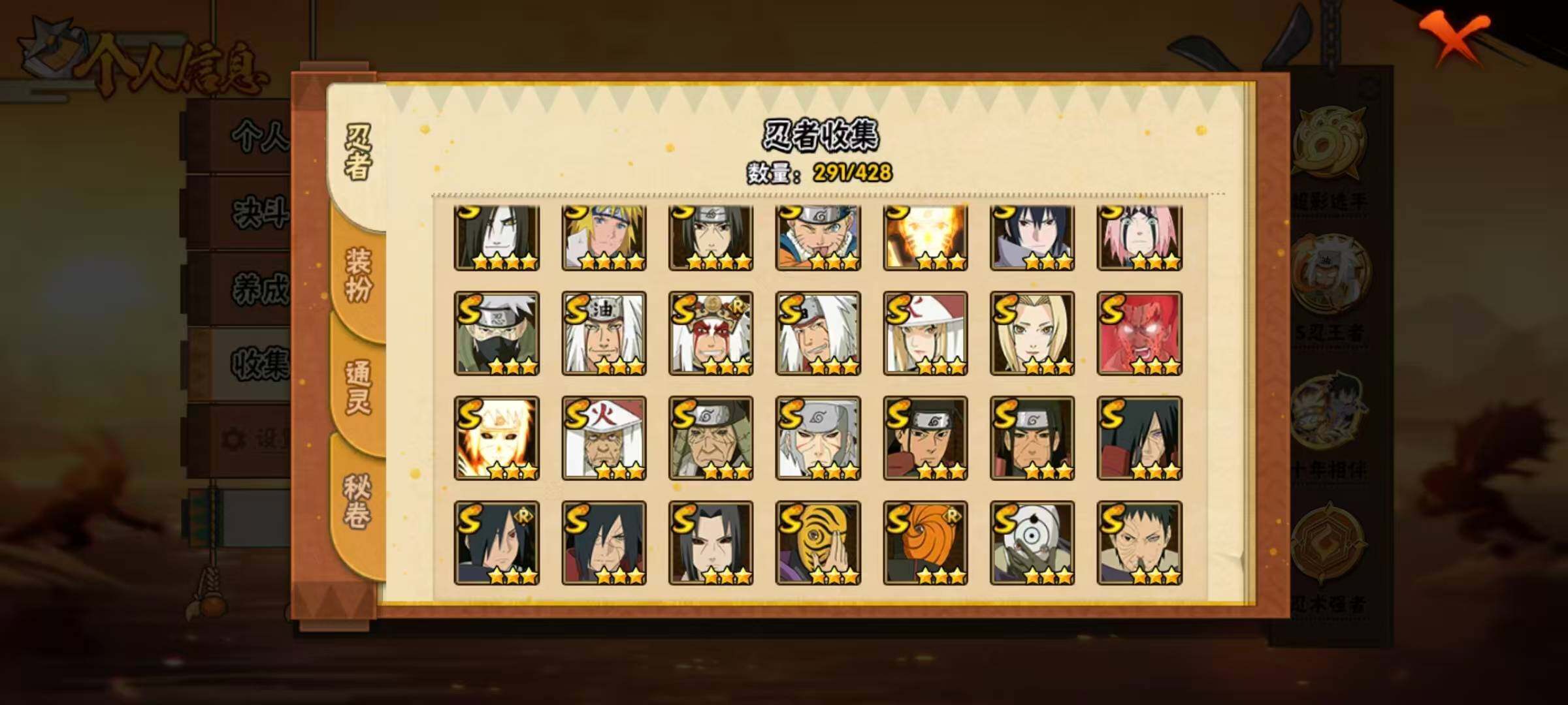 41S级忍者数-65A级忍者数【S级忍者】:长门「秽土转生」(3星),猿飞日斩「秽土转生」(3星),千手扉间「秽土转生」(3星),千手柱间「秽土转生」(3星),宇智波鼬「秽土转生」(3星),宇智波斑「秽土转生」(3星),宇智波斑「秽土转生·解」(3星),大野木「忍界大战」(3星),春野樱「忍界大战」(3星),宇智波带土「忍界大战」(3星),艾「忍界大战」(3星),宇智波鼬「须佐能乎」(4星),旗木卡卡西「须佐能乎」(3星),宇智波斑「木叶创立」(3星),无「二代目土影」(3星),艾「四代目雷影」