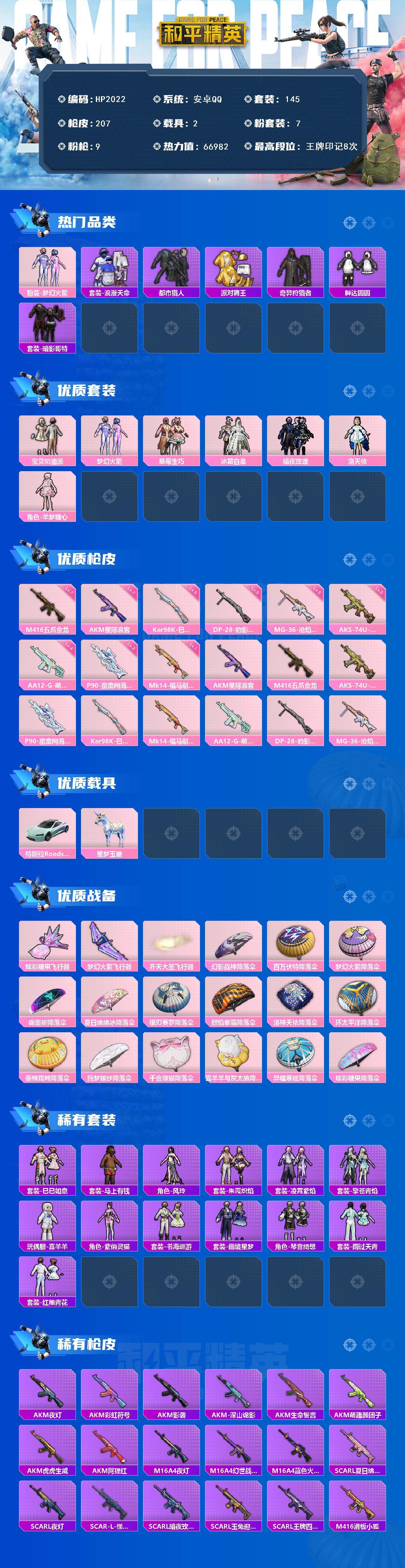 【HP2022】145套装/枪械9/装备241/载具2/战备139/王牌印记8/热力值66982/七级AKM-星际浪客/七级M416-五爪金龙/五级AKS-74U-森灵之息/三级P90-魔童闹海 敖丙/五级Kar98K-巳巳如意/一级Mk14-福马献瑞/四级AA12-G-萌骑幻想/五级DP-28-豹影疾电/五级MG-36-沧焰双生/粉装-梦幻火箭/套装-浪漫天命/套装-都市猎人/套装-派对舞王/套装-奇异狩猎者/套装-胖达圆圆/套装-暗影哥特/粉装-宝贝奶油派/粉装-草莓生巧/粉装-冰霜白皇/粉