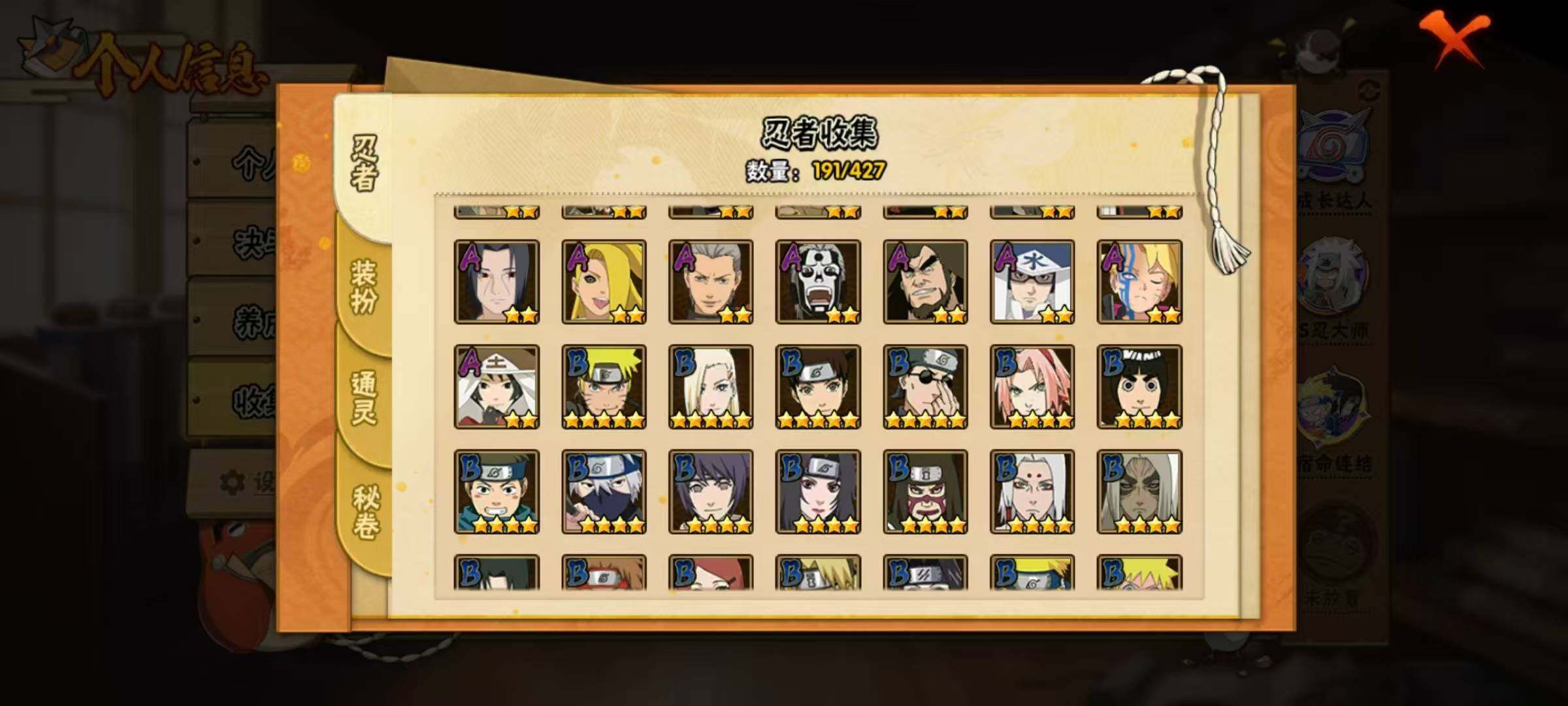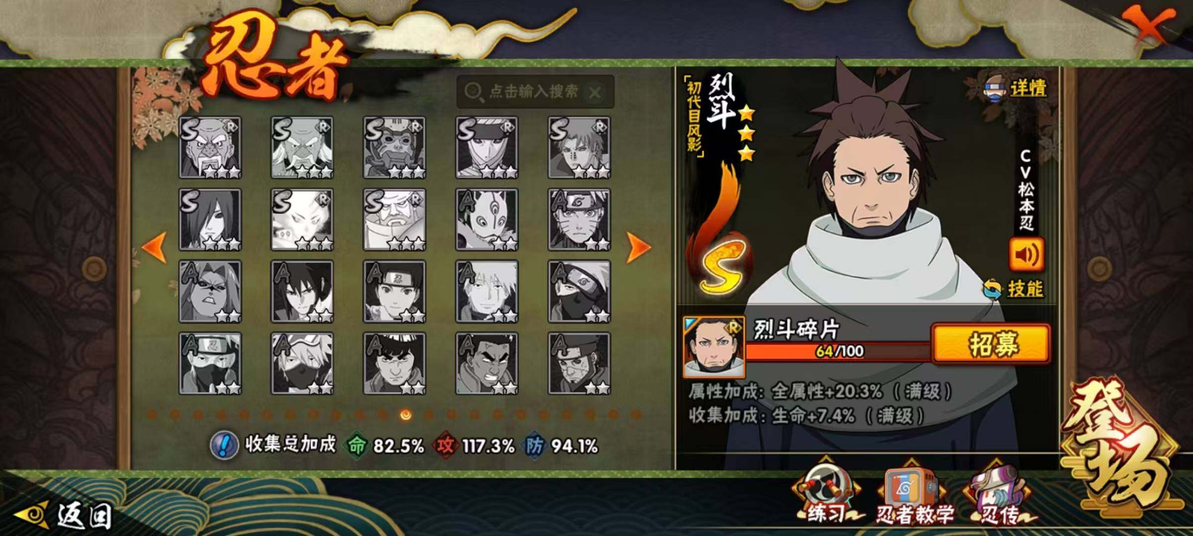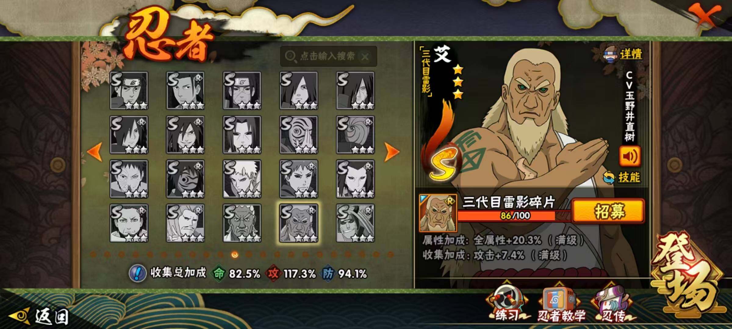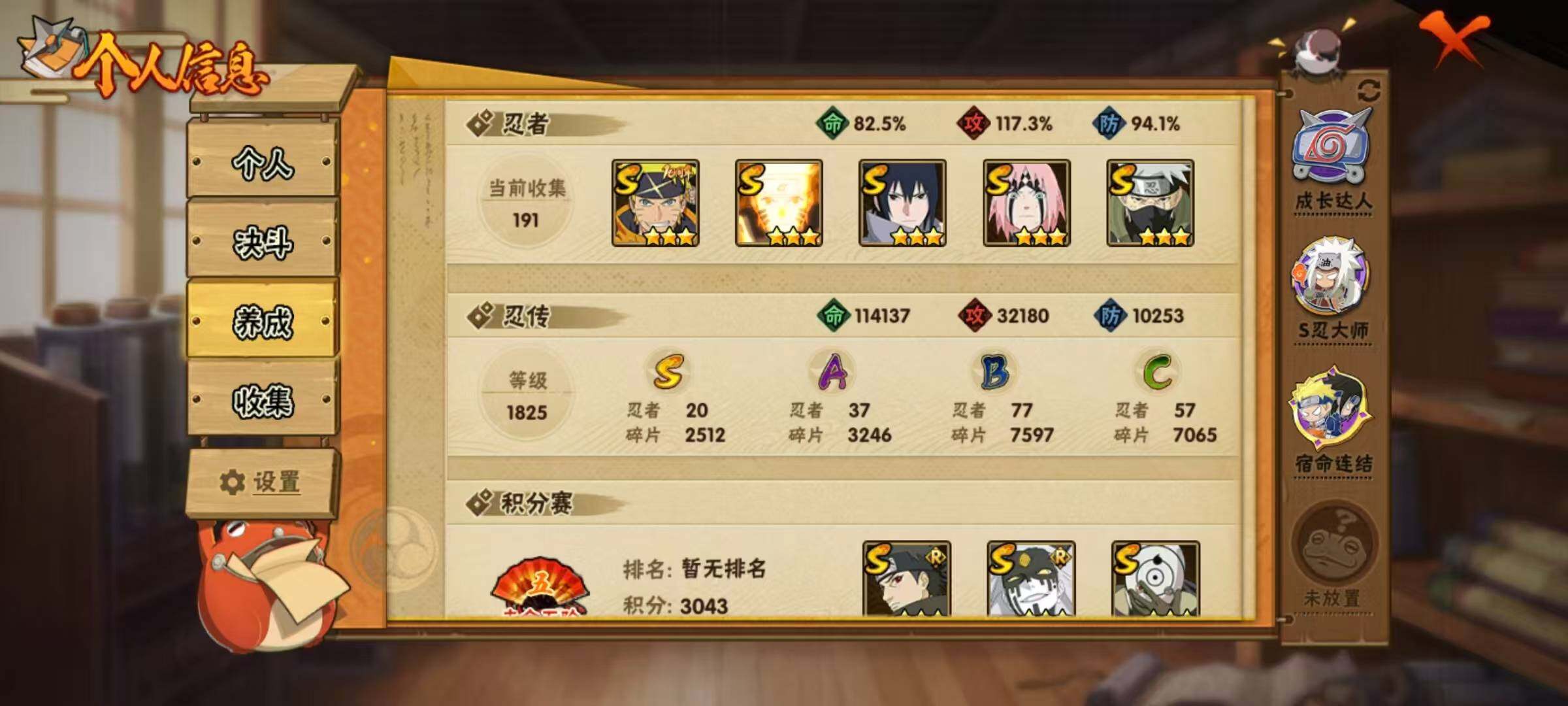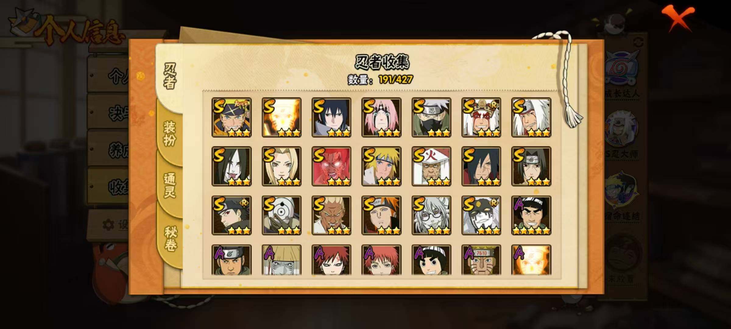 20S级忍者数-37A级忍者数【S级忍者】:宇智波斑「秽土转生·解」(3星),春野樱「忍界大战」(3星),艾「忍界大战」(3星),宇智波鼬「须佐能乎」(3星),宇智波止水「须佐能乎」(3星),旗木卡卡西「须佐能乎」(3星),自来也「舞之豪杰」(3星),大蛇丸(3星),自来也「传说中的三忍」(3星),纲手(3星),猿飞日斩(3星),波风水门(3星),药师兜「仙人模式」(3星),漩涡鸣人「九喇嘛连结」(3星),迈特凯「死门」(3星),佩恩「天道」(3星),宇智波佐助「永恒万花筒」(3星),宇智波斑