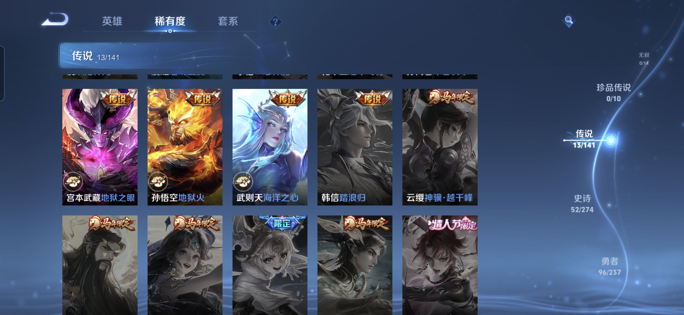 【传说皮肤】 鸣野蒿 神骥·逐星野 碎云 无双飞将 地狱之眼 冠军飞将 炽阳神光 一念神魔 末日机甲 地狱火 海洋之心 游龙清影 启明星使
