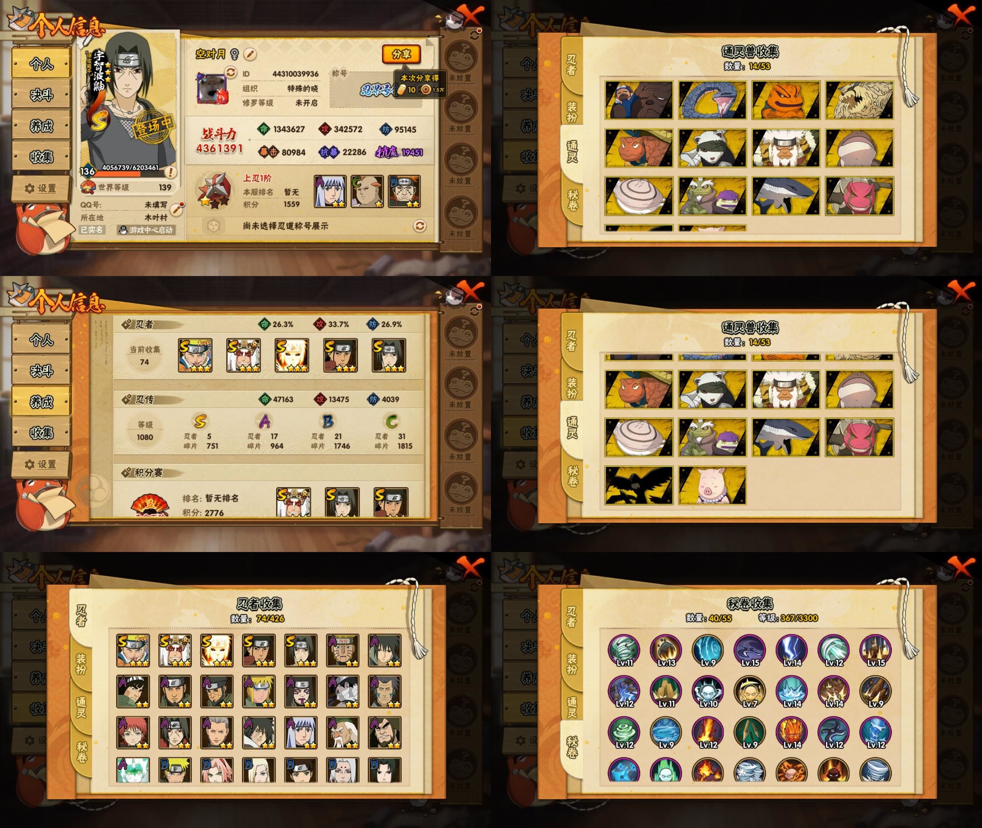 5S忍/17A忍/战力436W/V5/区服3100 【S忍者】宇智波佐助「漩涡鸣人」,自来也「舞之豪杰」,千手柱间,宇智波鼬「须佐能乎」,波风水门「九喇嘛连结」,
