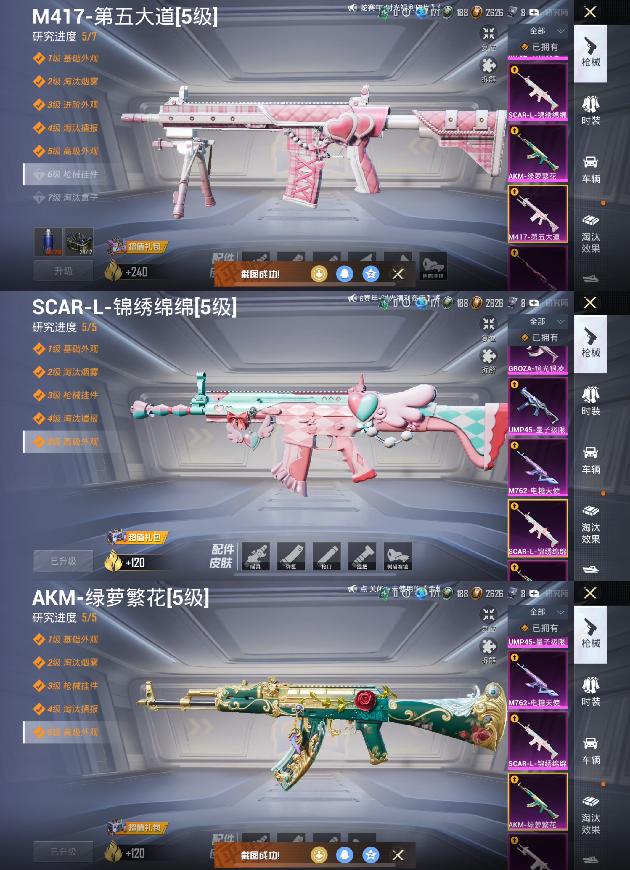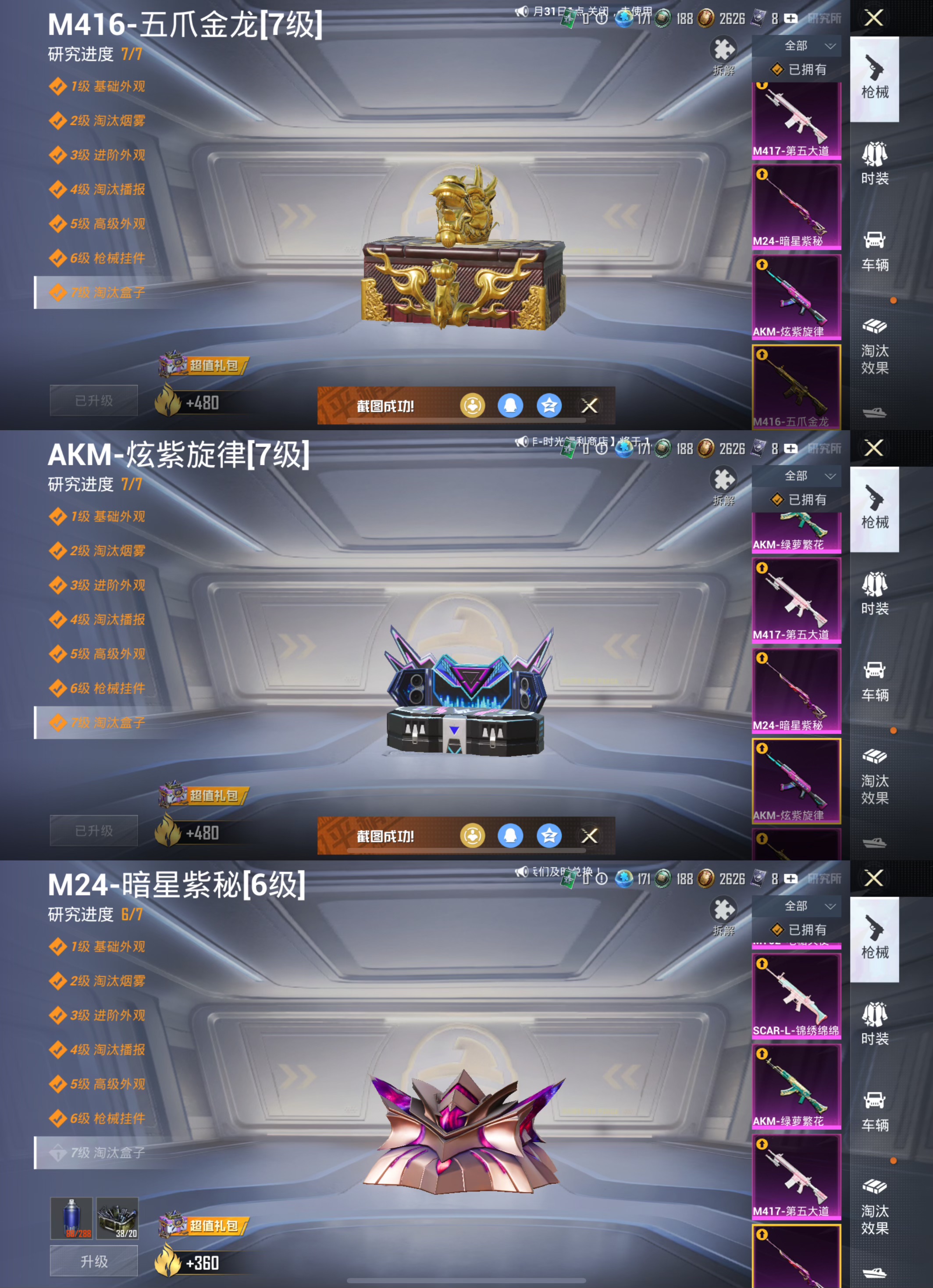 【12特效枪】GROZA-镜光银凌[5级],M24-暗星紫秘[6级],AUG-暖羊咩咩[5级],AKS-74U-森灵之息[5