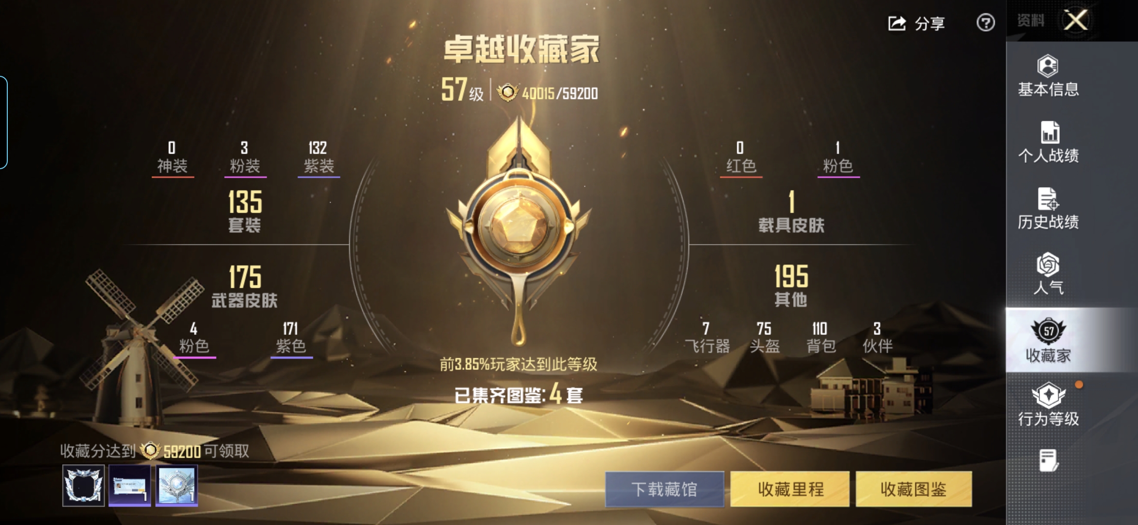 1载具-3粉装-4特效枪-135套装-194枪皮-10王牌印记-荣耀皇冠Ⅲ-55069热力值