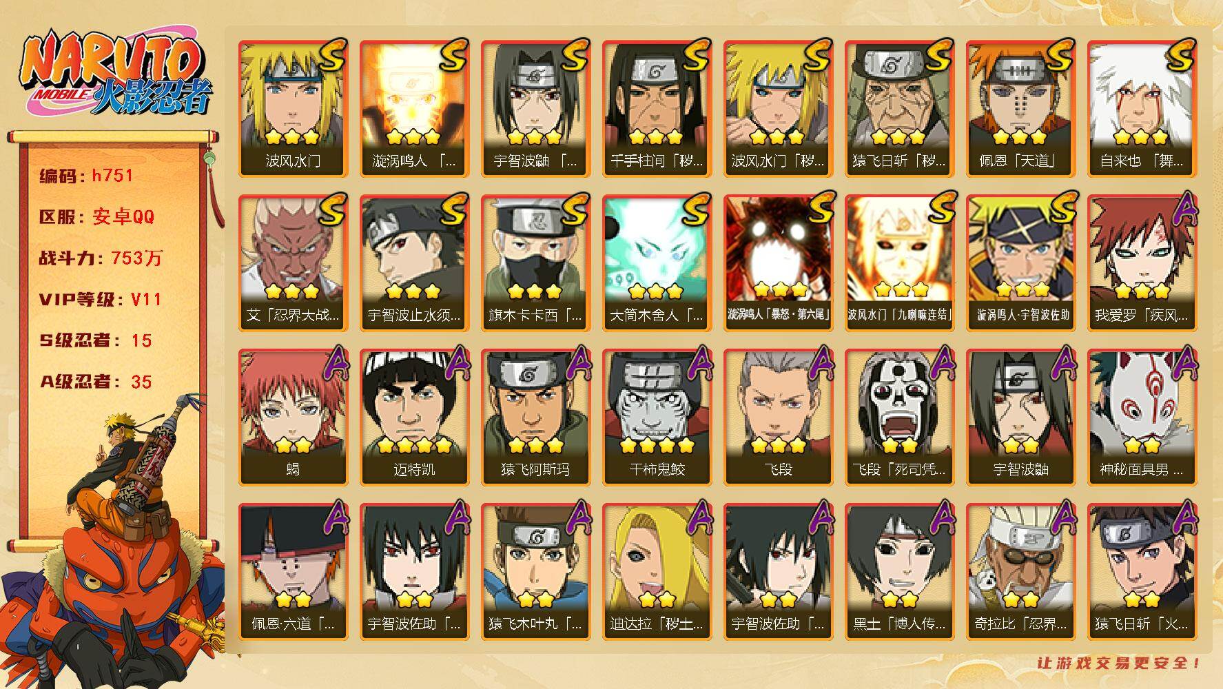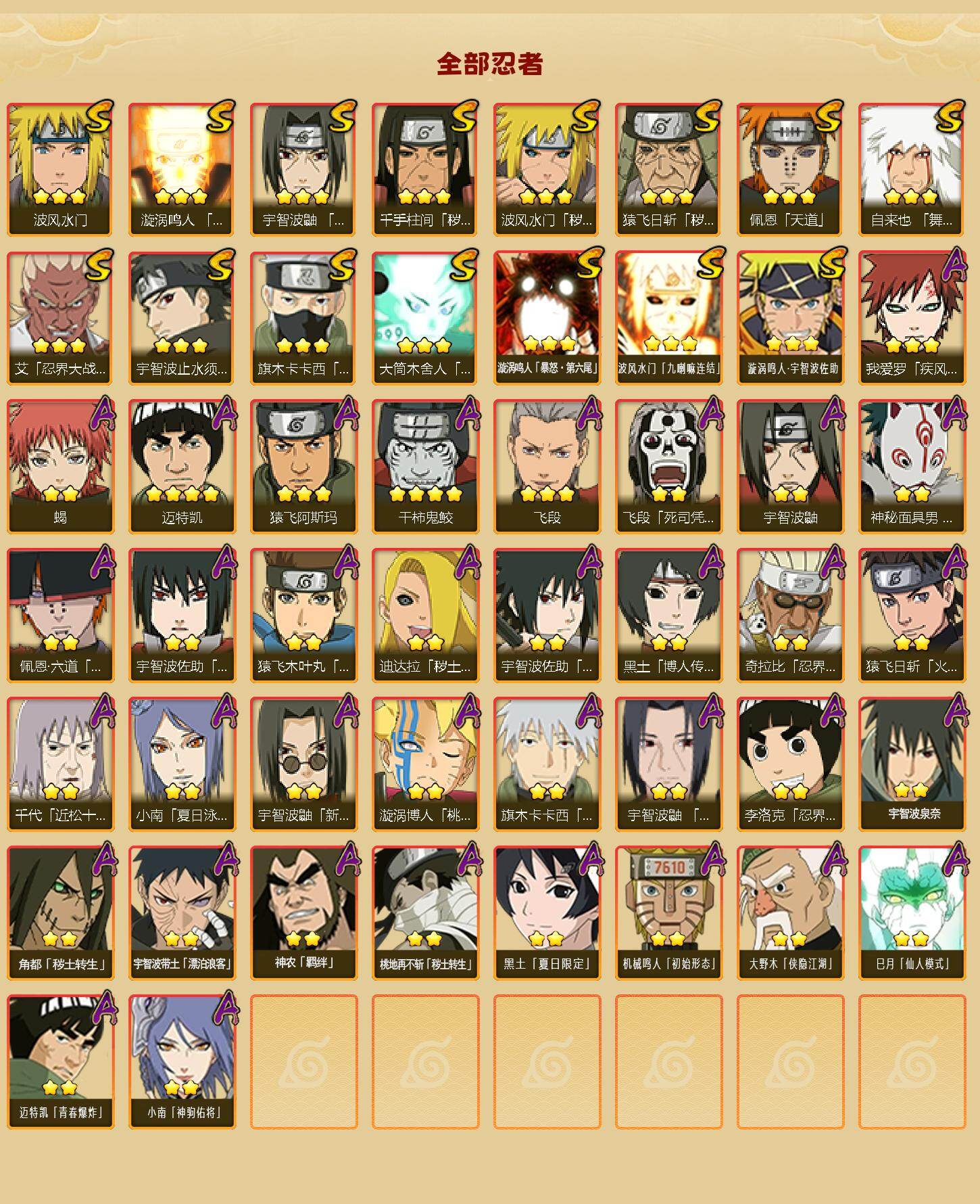 15S级忍者数-35A级忍者数【S级忍者】:猿飞日斩「秽土转生」(3星),波风水门「秽土转生」(3星),千手柱间「秽土转生」(3星),艾「忍界大战」(3星),宇智波鼬「须佐能乎」(3星),宇智波止水「须佐能乎」(3星),旗木卡卡西「须佐能乎」(3星),自来也「舞之豪杰」(3星),波风水门(3星),漩涡鸣人「九喇嘛连结」(3星),佩恩「天道」(3星),大筒木舍人「最终章」(3星),漩涡鸣人「暴怒·第六尾」(3星),波风水门「九喇嘛连结」(3星),漩涡鸣人·宇智波佐助(3星)【A级忍者】:迪达拉「秽