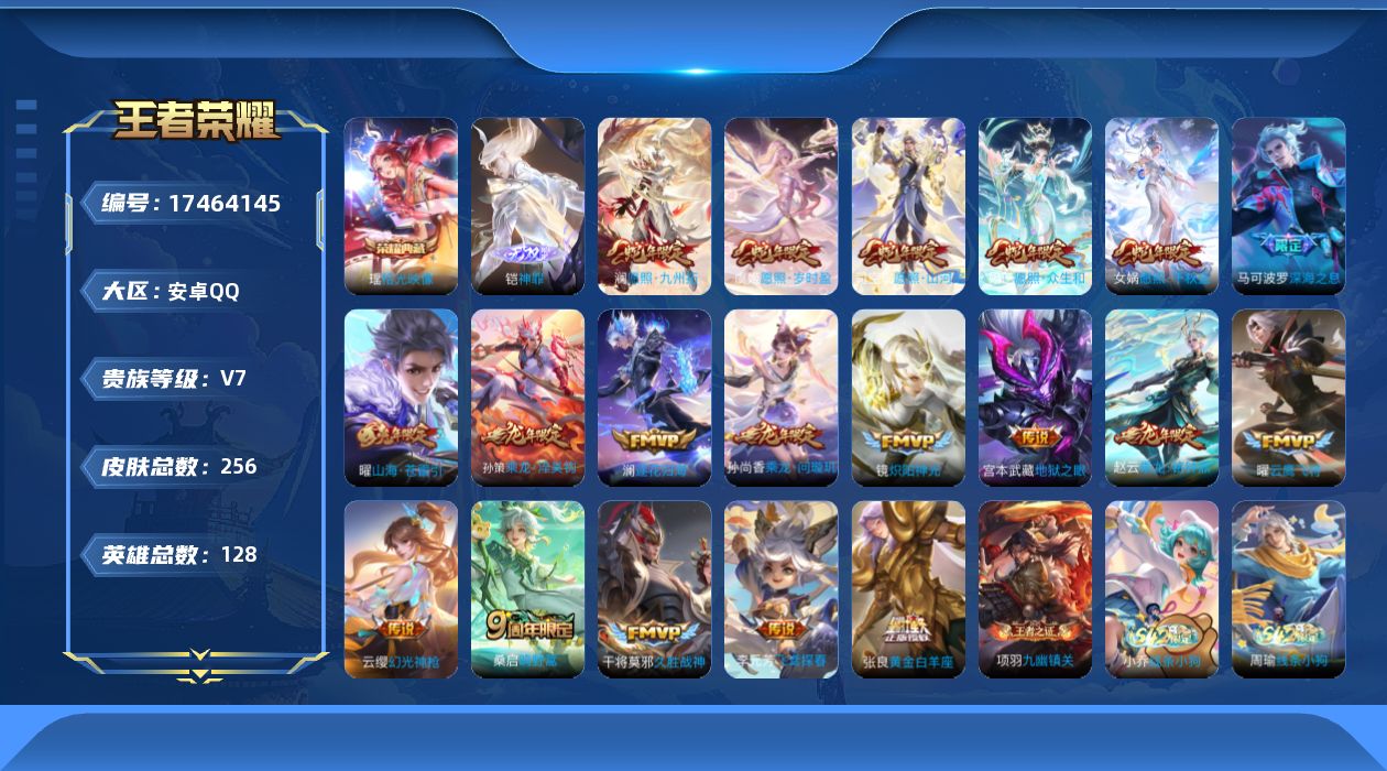 858-[17464145]贵族7-贵族积分37005-255皮1典藏19传说1无双 安卓手Q390区 营地ID1798117467最强王者【无双皮肤】:神罪【荣耀典藏】:拾光映像【优质限定皮肤】:至尊宝,山海·苍雷引【传说皮肤】:久胜战神,飞鸢探春,深海之息,炽阳神光,愿照·九州拓,地狱之眼,鸣野蒿,黄金白羊座,幻光神枪,云鹰飞将,逐花归海,乘龙·铭钟鼎,愿照·千秋盛,愿照·众生和,乘龙·淬吴钩,愿照·岁时盈,愿照·山河定,山海·苍雷引,乘龙·问璇玑【史诗皮肤】:线条小狗,逐浪之夏,九幽镇关,