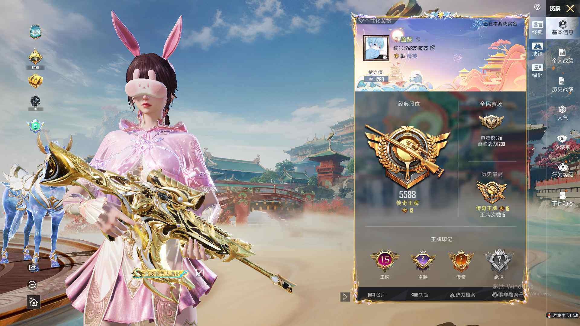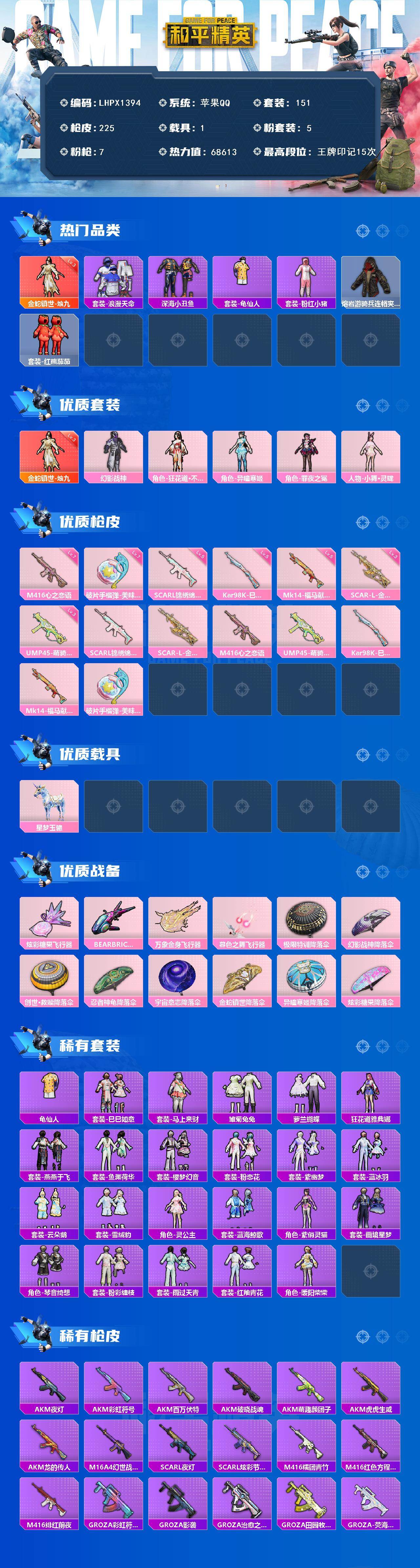 苹果 手Q-1神装-5粉装-7特效枪-1载具-4粉色飞行器-68613热力值-15王牌印记-151套装-225枪皮