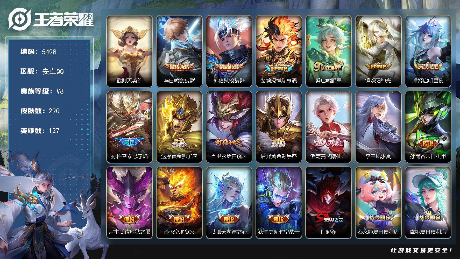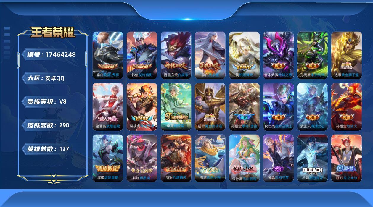 435-[17464248]贵族8-贵族积分96292-290皮2典藏15传说0无双 安卓手Q148区营地ID3171276最强王者【荣耀典藏】:弑枪猎影,鸣剑·曳影【优质限定皮肤】:凤求凰,白虎志,至尊宝【传说皮肤】:炽阳神光,地狱之眼,祥瑞亨通,鸣野蒿,启明星使,零号·赤焰,凤求凰,黄金狮子座,黄金射手座,白虎志,海洋之心,武陵仙君,超时空战士,地狱火,末日机甲【史诗皮肤】:幽灵船长,箭羽风息,雪上飞焰,修罗,锁墨魂,九幽镇关,地狱岩魂,暗渊魔法,乐园奇幻夜,末日机甲,涂山容容,百相守梦,原