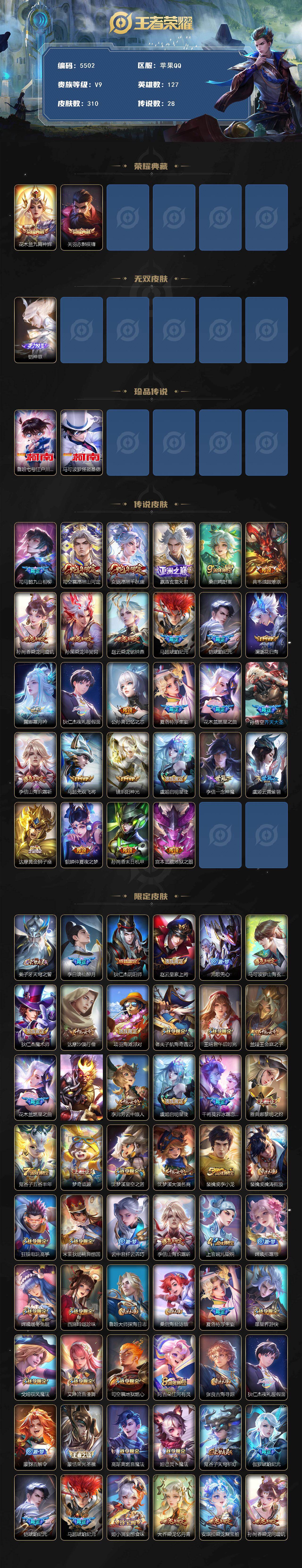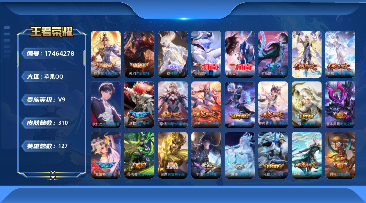 378-[17464278]贵族9-贵族积分101304-310皮2典藏28传说1无双2珍品传说 苹果手Q132区 营地ID1738726948永恒钻石IV【珍品传说皮肤】:怪盗基德,江户川柯南【无双皮肤】:神罪【荣耀典藏】:九霄神辉,赤影疾锋【优质限定皮肤】:神威,无双飞将,山海·炽霜斩【传说皮肤】:地狱之眼,九山相柳,愿照·千秋盛,愿照·山河定,云霓雀翎,浮生妄,玄雷天君,记忆之芯,霜月吟,末日机甲,鸣野蒿,一念神魔,启明星使,战鼓燎原,仲夏夜之梦,黄金狮子座,乘龙·淬吴钩,乘龙·铭钟鼎,乘