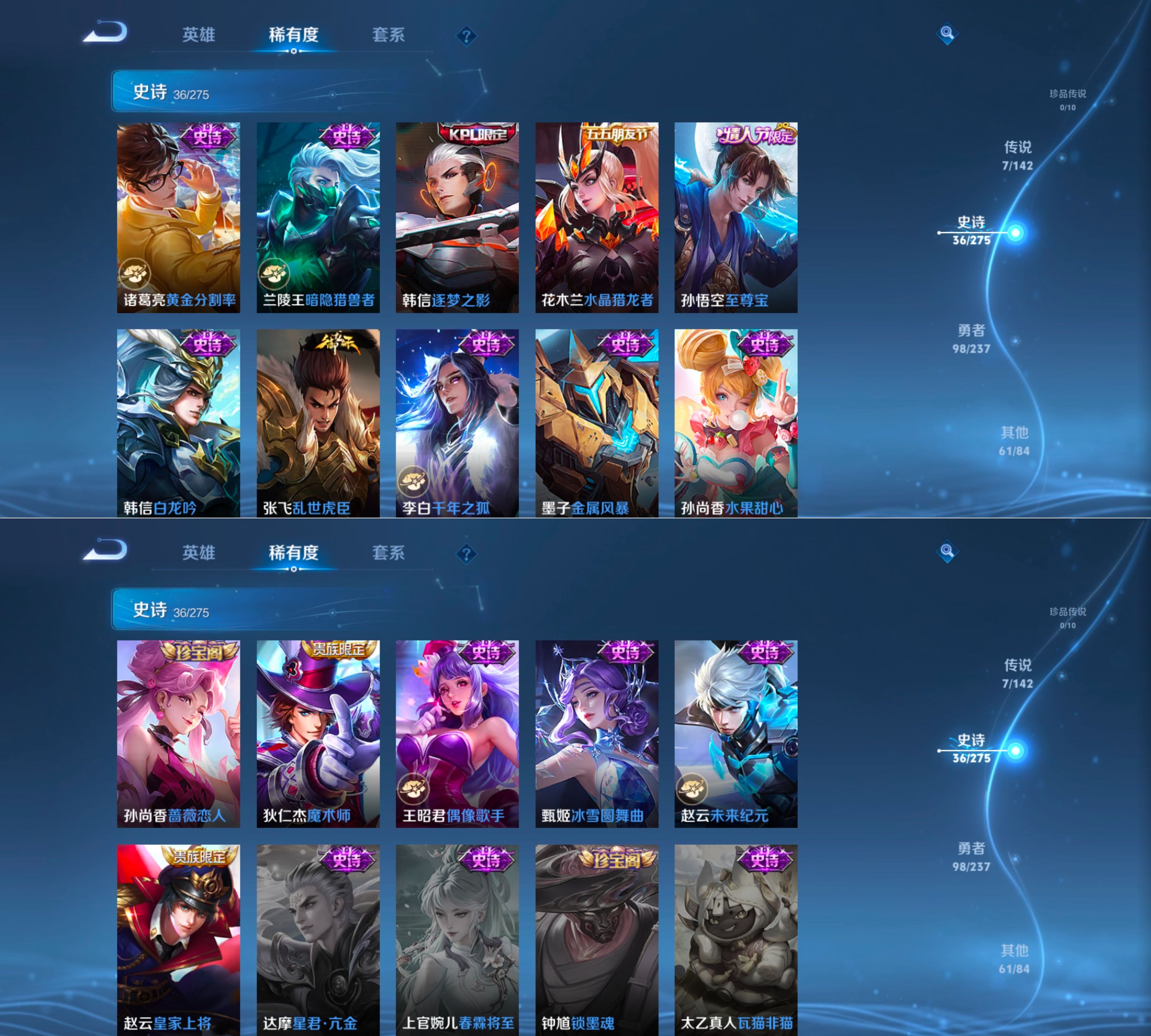 【史诗皮肤】 天狼征服者 逐梦之影 飞衡 谧流熔炉 神威 大圣娶亲 至尊宝 王牌新星 死神来了 化蝶舞 朱雀志 拒霜思 魔术师 鹰眼统帅 白龙吟 水晶猎龙者 修罗 曙光守护者 暗隐猎兽者 航海奇遇记 千年之狐 银河之约 狮舞东方 暗影游猎 金属风暴 梁祝 李小龙