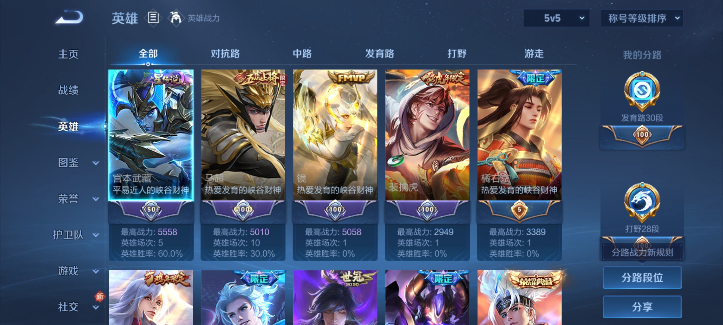 309皮肤V8 2典藏 24传说 2星传说 发育路30段 打野