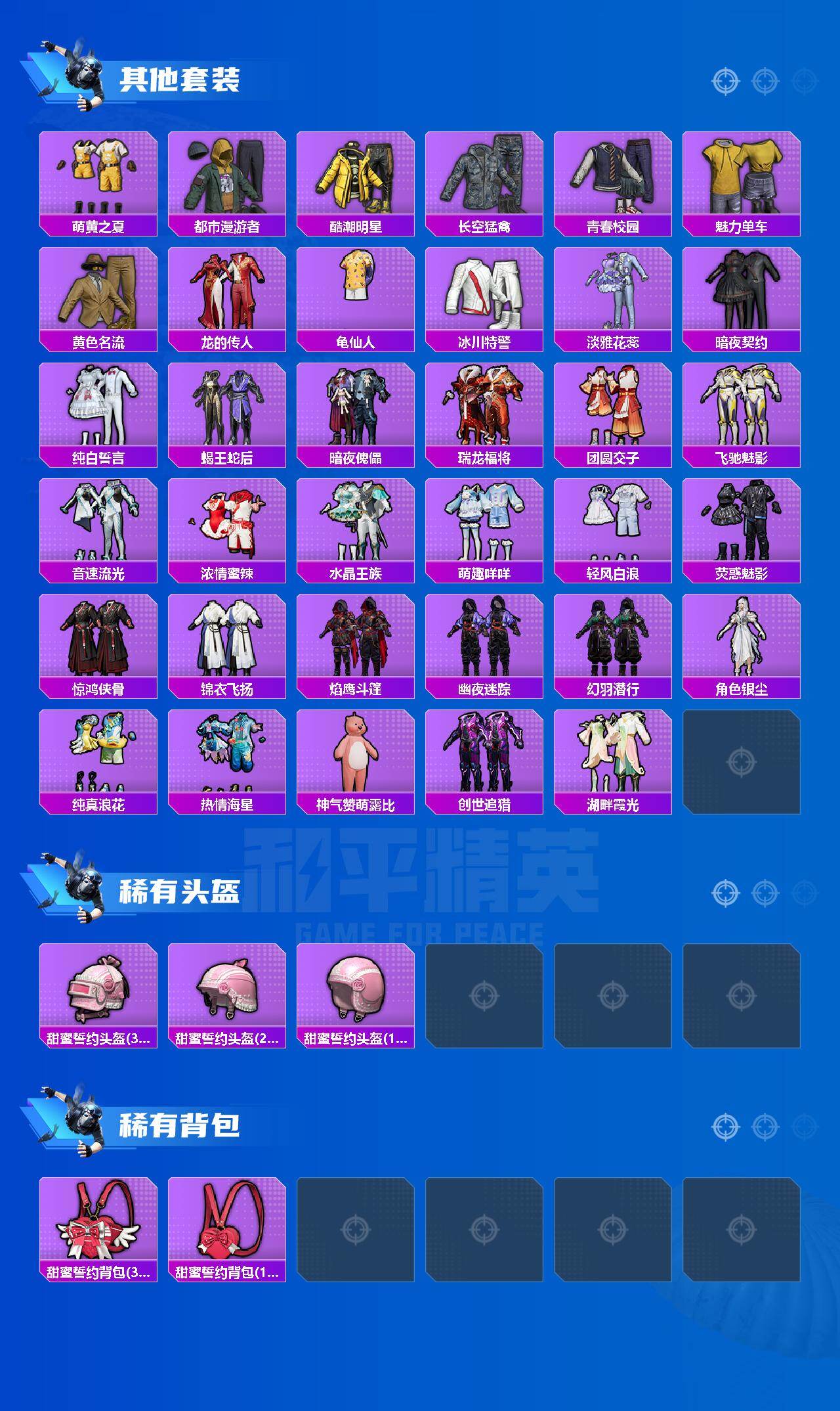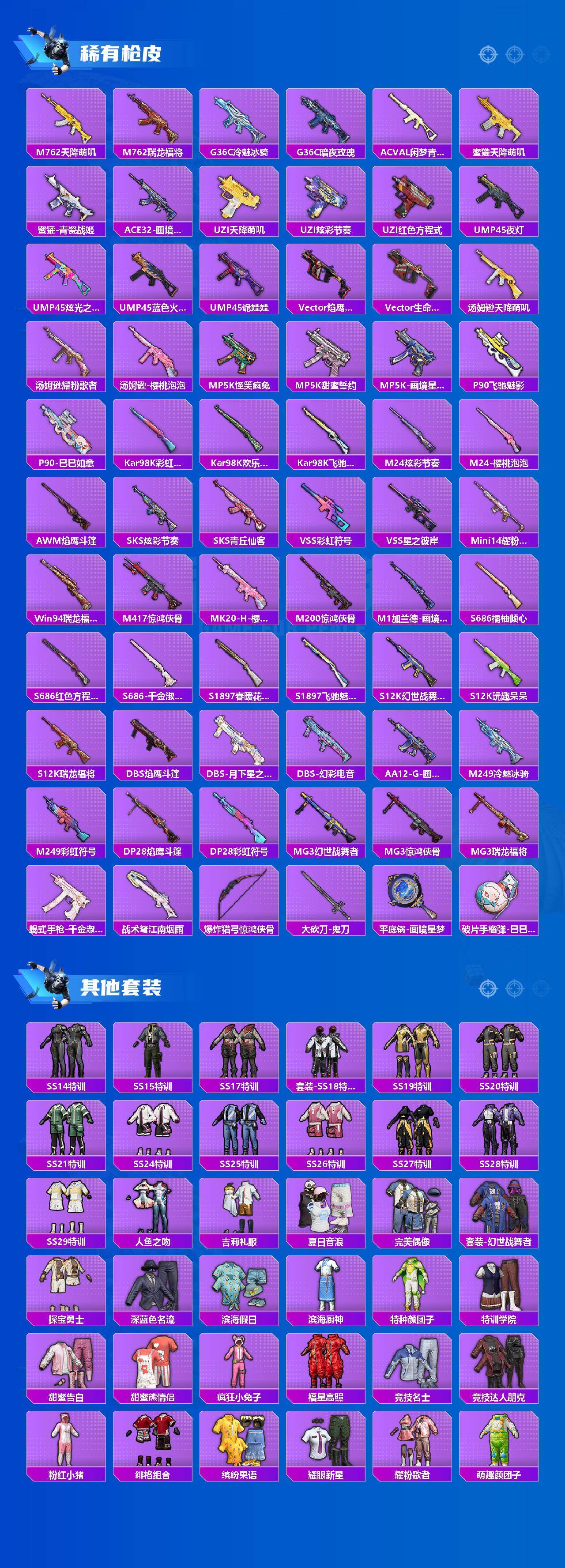 【粉色枪皮等级】:SCAR-L-锦绣绵绵(五级),M416-电玩时刻(五级),GROZA-镜光银凌(五级),AUG-暖羊咩咩(五级),AKS-74U-森灵之息(四级),Kar98K-巳巳如意(五级),Mk14-樱桃泡泡(四级)