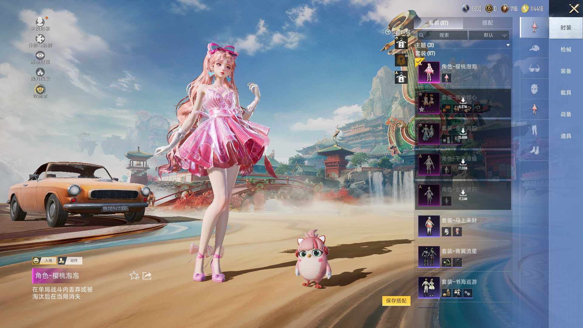 【粉色套装】:粉装-橘柚倾心,粉装-金丰海韵,角色-千金淑猫,角色-女娲灵识,角色-樱桃泡泡