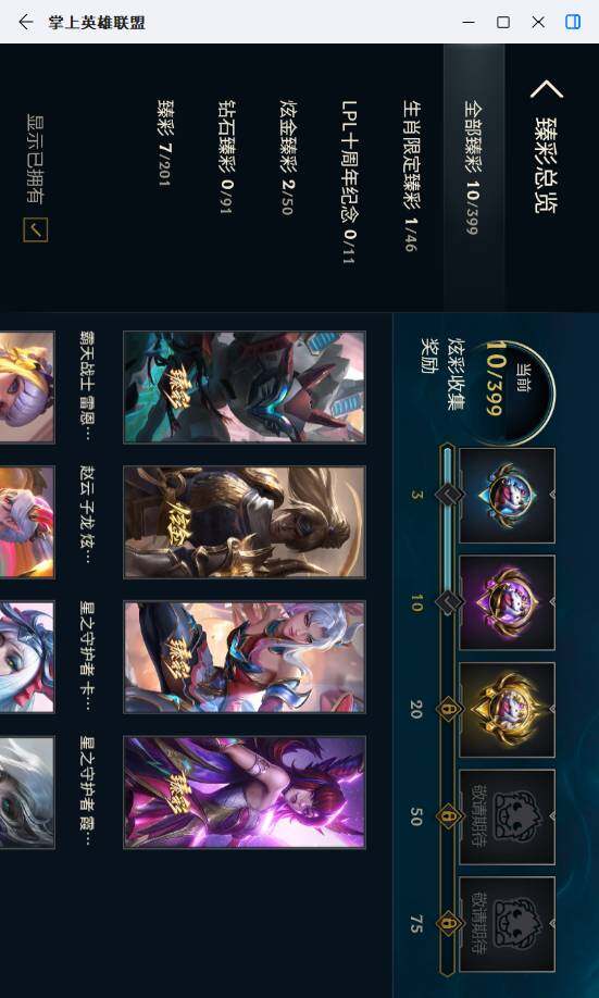 【臻彩皮肤】:天龙之子卡莎飞龙乘云,赵云子龙炫金将军,冠军掠夺者卡兹克凯旋圣装,霸天战士雷恩加尔星啸天火,源计划毁灭派克幻灭,咖啡甜心金克丝核桃巴菲,星之守护者卡莎热情之光,星之守护者霞烈羽,魔女阿卡丽虚荣,净雪之月莫甘娜冬虹