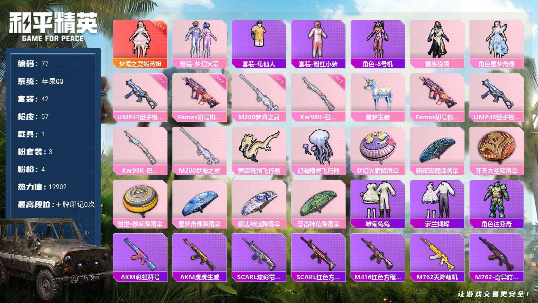 XS528【1神装3粉4特1车 梦海之灵-妮芮妲1级 星梦玉骢 星梦奇缘 梦幻火箭 粉螳螂 M200-梦海之灵 (3级)Famas-觉醒初号机 (4级)幻海精灵飞行器】苹果Q-19902热力值 历史荣耀皇冠Ⅱ 41套装 57枪皮 【1载具】 星梦玉骢 【1神装】 梦海之灵-妮芮妲1级 【3粉装】 梦幻火箭 星梦奇缘 黄族统领 【4特效枪】 Famas-觉醒初号机 (4级) Kar98K-巳巳如意 (2级) M200-梦海之灵 (3级) UMP45-量子极限 (4级) 【2飞行器】 幻海精灵飞行器