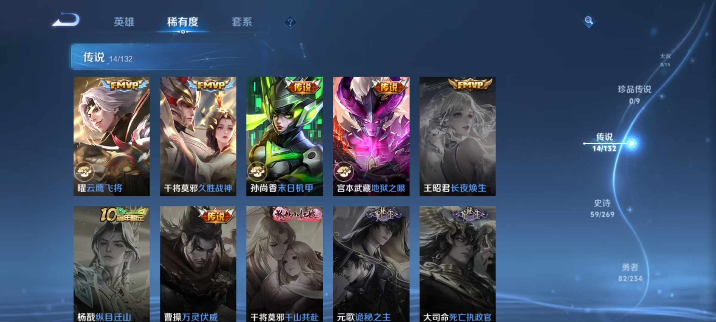 【传说皮肤】 鸣野蒿 逐花归海 神树通天 无限倾心 齐天大圣 山海·炽霜斩 久胜战神 地狱之眼 绛天战甲 末日机甲 云鹰飞将 启明星使 淬星耀世 时雨天司