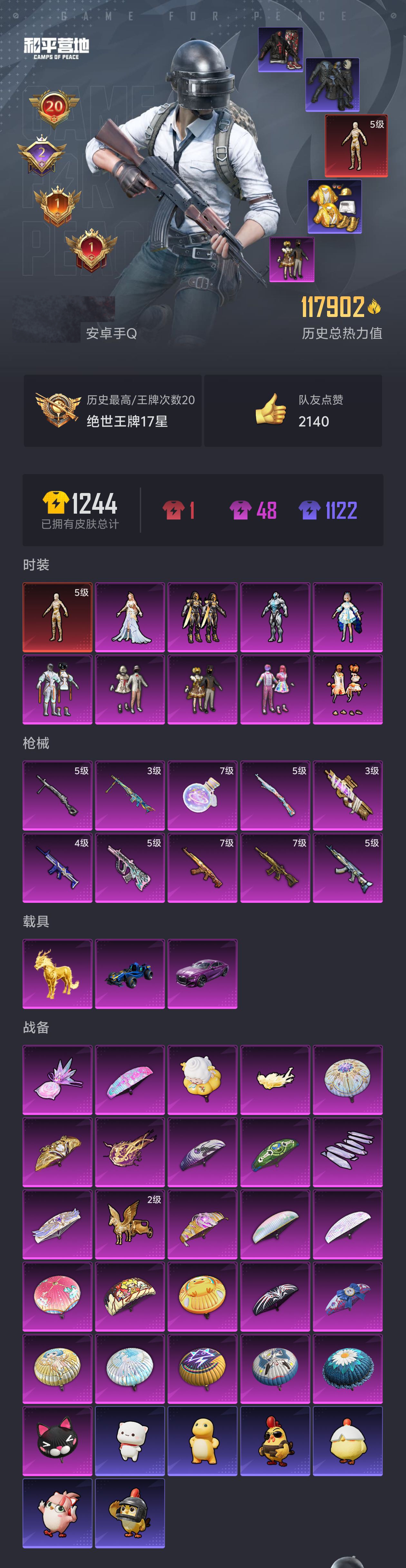 M1044952【5级图卡盟网络男神素材极品身法号 20高印记 赤蝎 都市 金鞋 三姐妹 洛天依 深海 暗夜之虎 银碳小老虎 小丑鱼 红眼罩】安卓Q-1红装6稀有3载具9粉装10特效枪21热门248套装339枪皮 117902热力值 20印记 历史绝世王牌17星 【1红装】 沙丘之主-图卡盟 (5级) 【6稀有】 赤蝎幽灵 AKM-缤纷海域 都市猎人 浪漫天命 派对舞王 派对舞王(金靴子) 【3载具】 宾利BATUR(极速紫) 合金龙骨蓝色 护世瑞兽 【9粉装】 宝贝奶油派 天使彩虹糖 甜心巧克