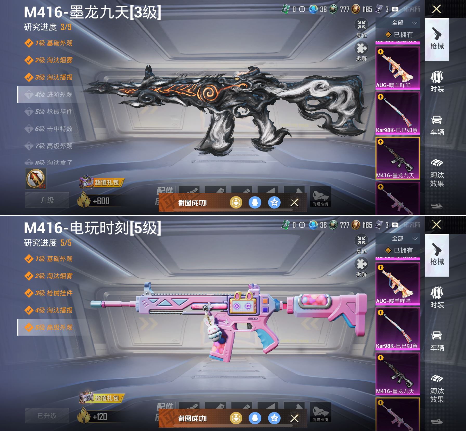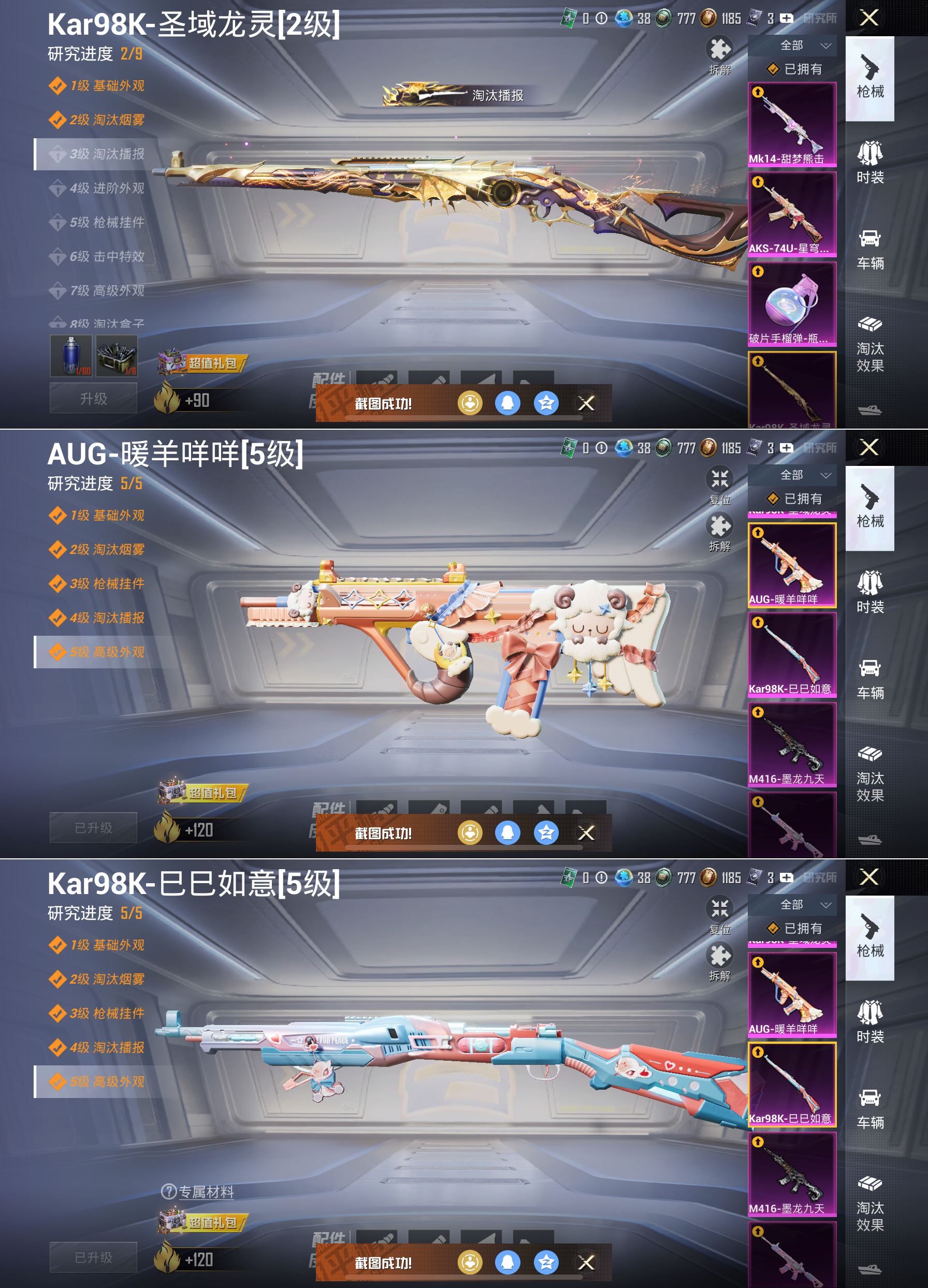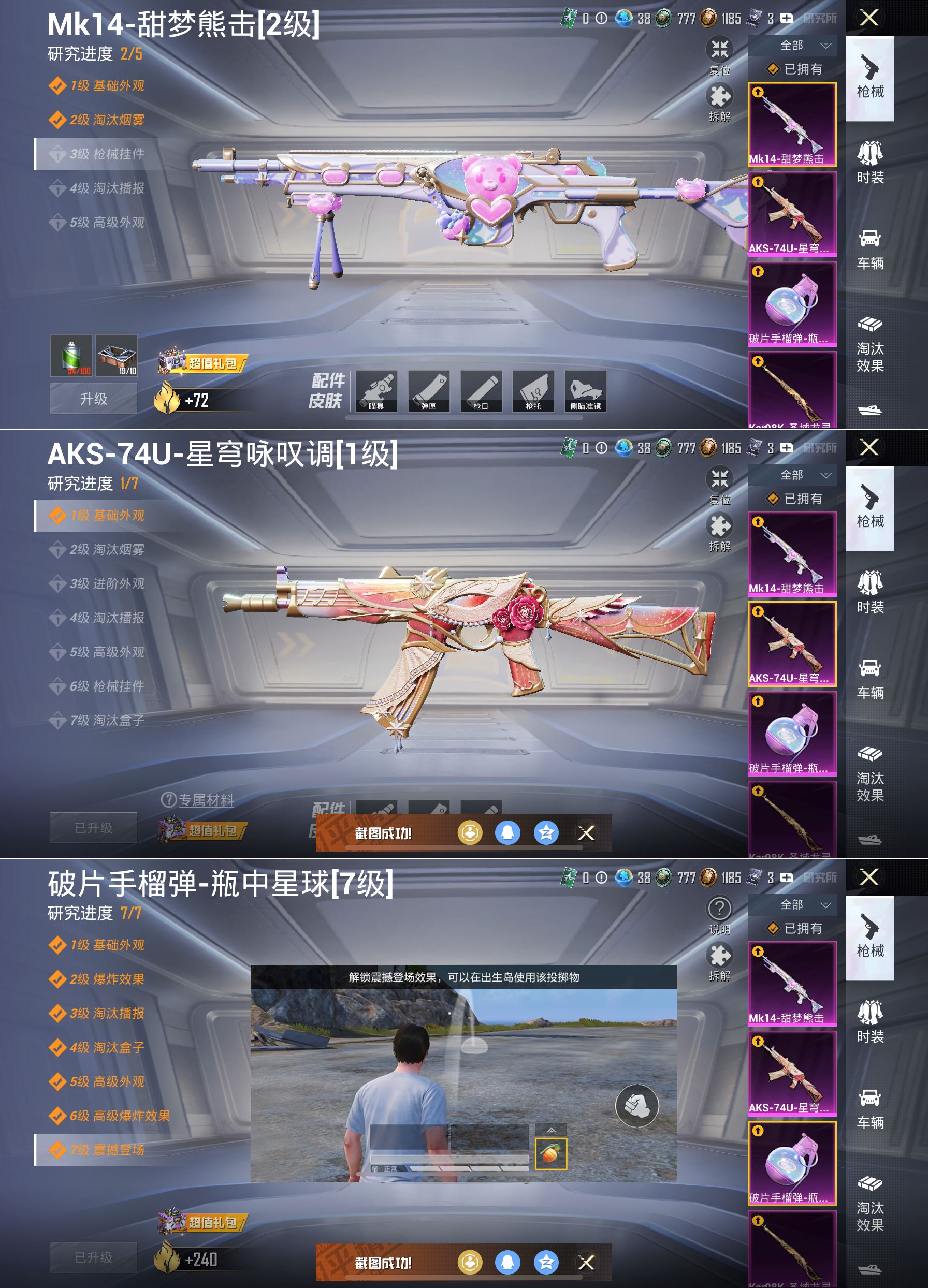 【1粉装】 星穹咏叹调 【8特效枪】 M416-墨龙九天 (3级) M416-电玩时刻 (5级) AKS-74U-星穹咏叹调 (1级) Kar98K-圣域龙灵 (2级) Kar98K-巳巳如意 (5级) AUG-暖羊咩咩 (5级) Mk1
