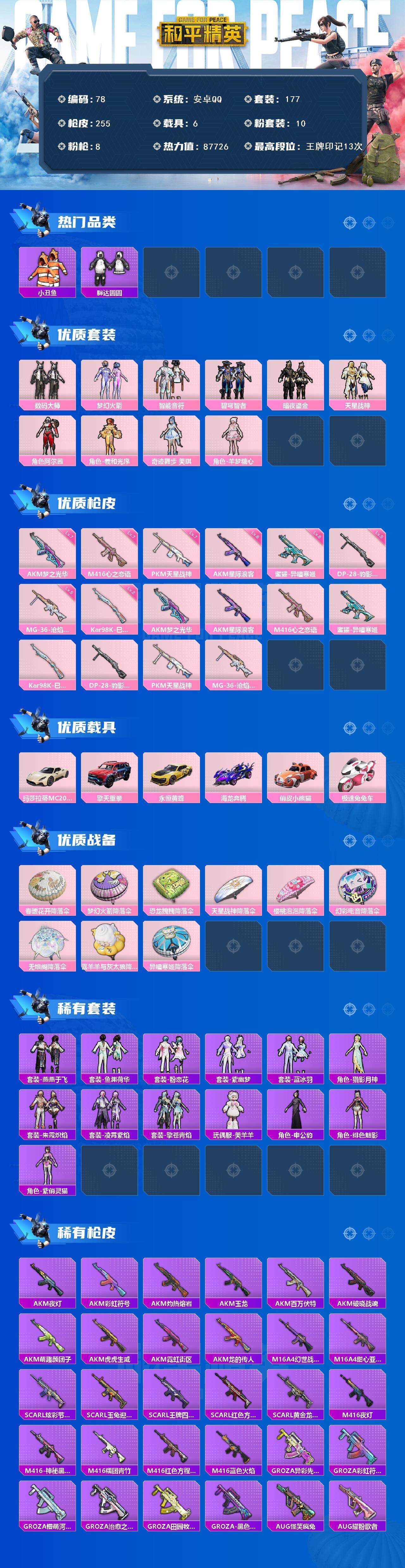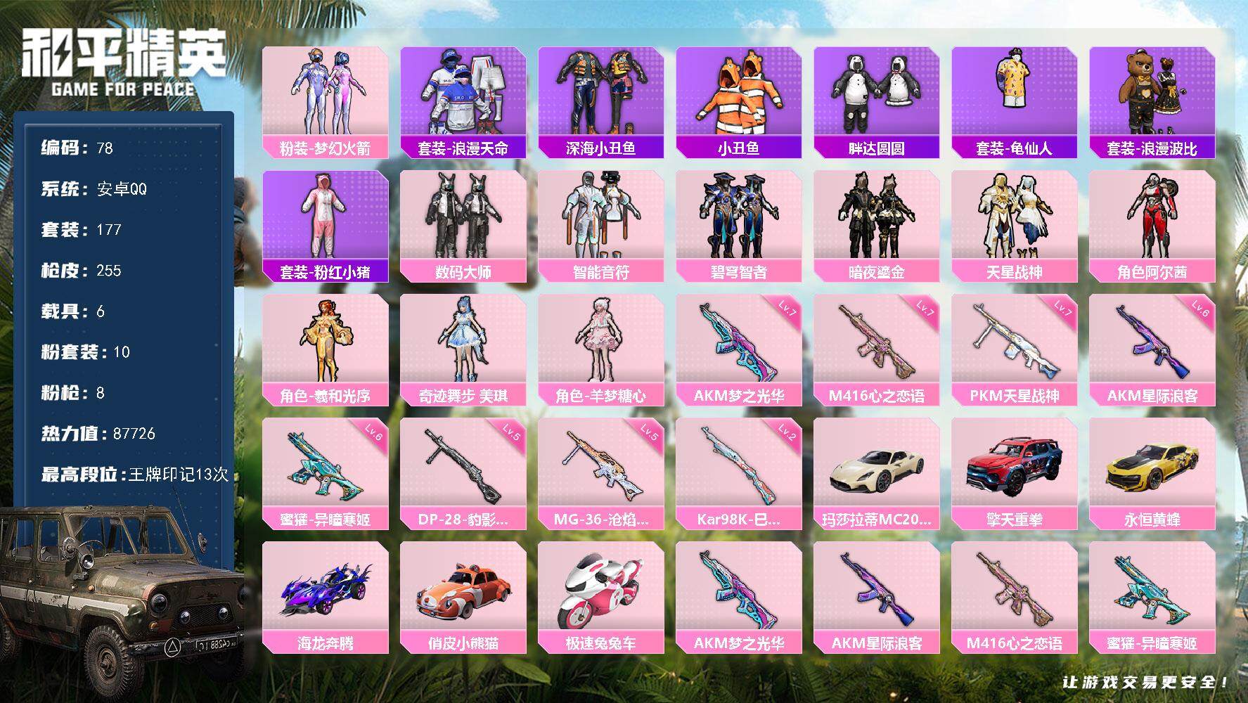 WJ737【男神素材身法号6载具10粉装8特效 梦幻火箭 深海小丑鱼 胖达 心之恋语满级】安卓Q-2稀有6载具10粉装8特效枪21热门177套装255枪皮 87726热力值 13印记 历史超级王牌17星 【2稀有】 AKM-百万伏特 浪漫天命 【6载具】 玛莎拉蒂M白色 擎天重拳 永恒黄蜂 海龙奔腾 俏皮小熊猫 极速兔兔车 【10粉装】 梦幻火箭 奇迹舞步美琪 阿尔茜 天星战神 羊梦糖心 羲和光序 智能音符 碧穹智者 数码大师 暗夜鎏金 【8特效枪】 M416-心之恋语 (7级) Kar98K-