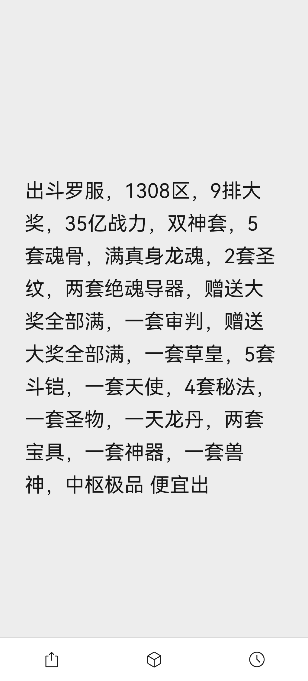 赠送大奖全部满,一套审判,赠送大奖全部满,一套草皇,5套斗铠,一套天使,4套秘法,两套宝具,便宜出