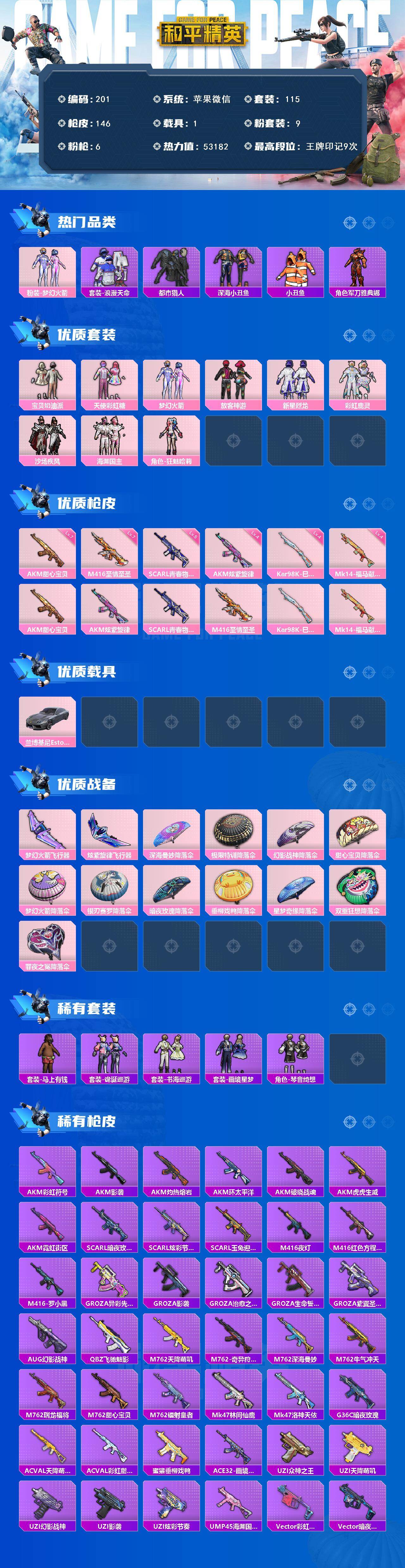 XS11388【身法号9粉装-6特效枪-1载具 梦幻火箭 浪漫天命 都市猎人 深海小丑鱼 至情至圣(七级)】苹果Q-115套装-146枪皮-9粉装-6特效枪-1载具【粉装】宝贝奶油派 天使彩虹糖 梦幻火箭 放客神游 新星烈龙 彩虹鹿灵 狂魅哈莉 海渊国主【载具】兰博基尼E【特效枪】AKM甜心宝贝 M416至情至圣 AKM炫紫旋律 SCARL青春物语 Mk14-福马献瑞 Kar98K-巳巳如意【稀有】浪漫天命 都市猎人 深海小丑鱼 小丑鱼 军刀雅典娜