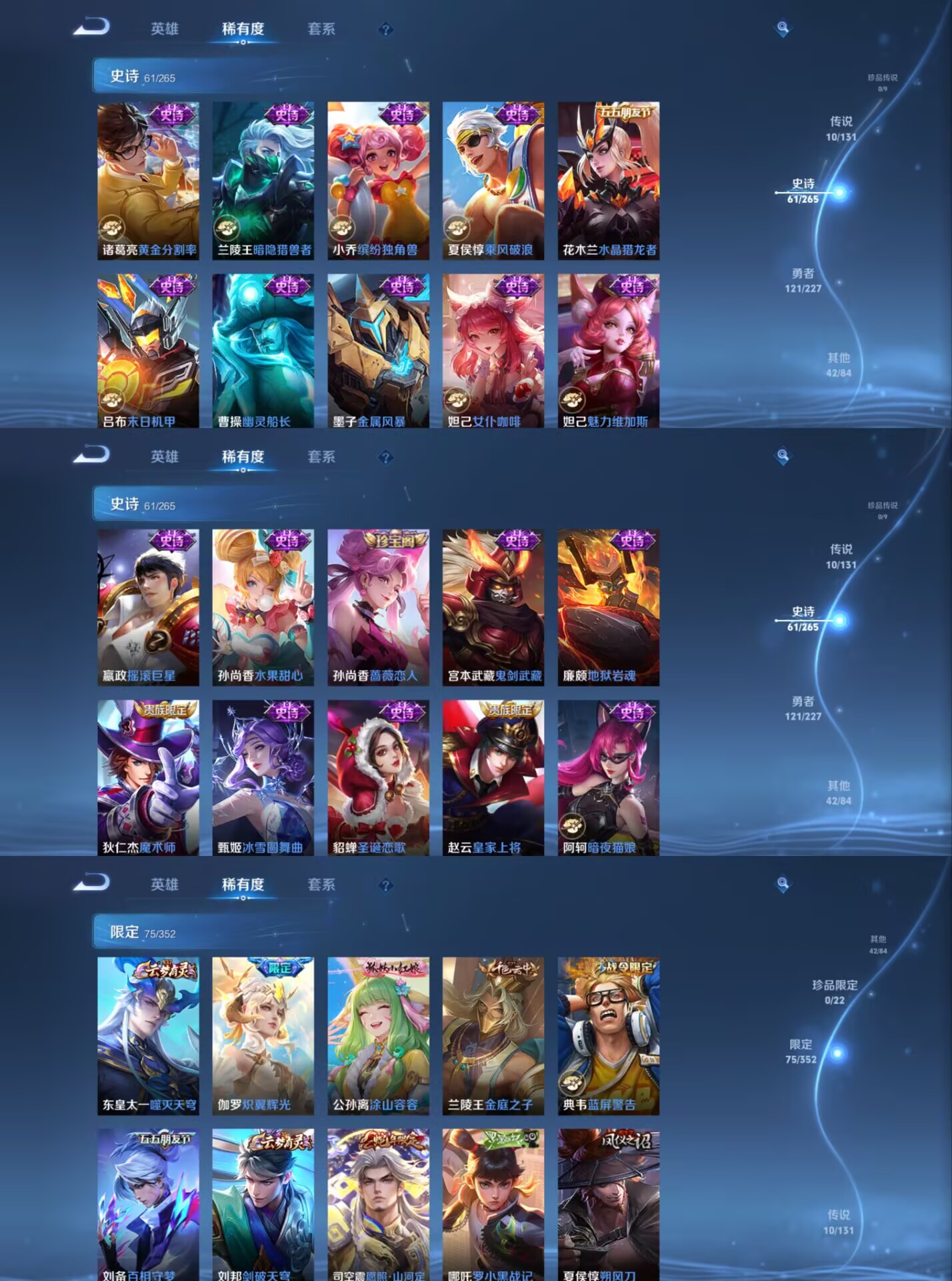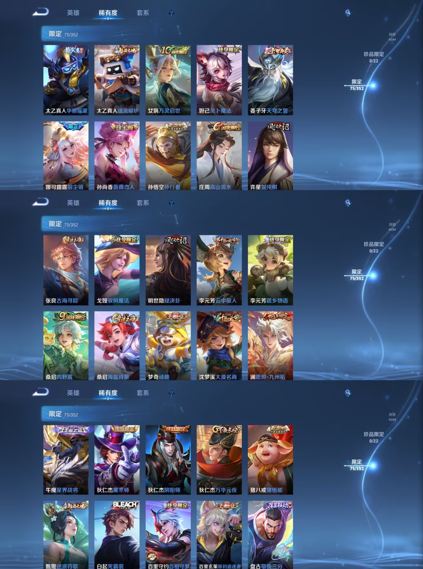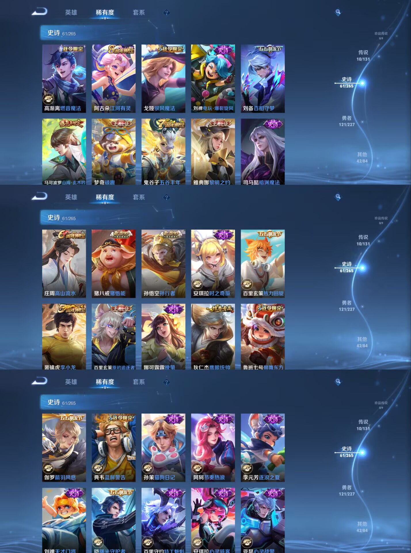 【史诗皮肤】 蔬乡物语 蔬乡物语 星界战将 百相守梦 器灵·浮梦炉 布丁狗之约 谧流熔炉 涂山容容 孙行者 熊喵少女 罗小黑战记 山海·玄木吟 青焰无极 踏浪烽翎 苍威无极 聚星闪耀 江河有灵 荣光圣徽 顽岩魄 万灵启世 化蝶舞 顽趣 驭风魔法 热力回旋 幽