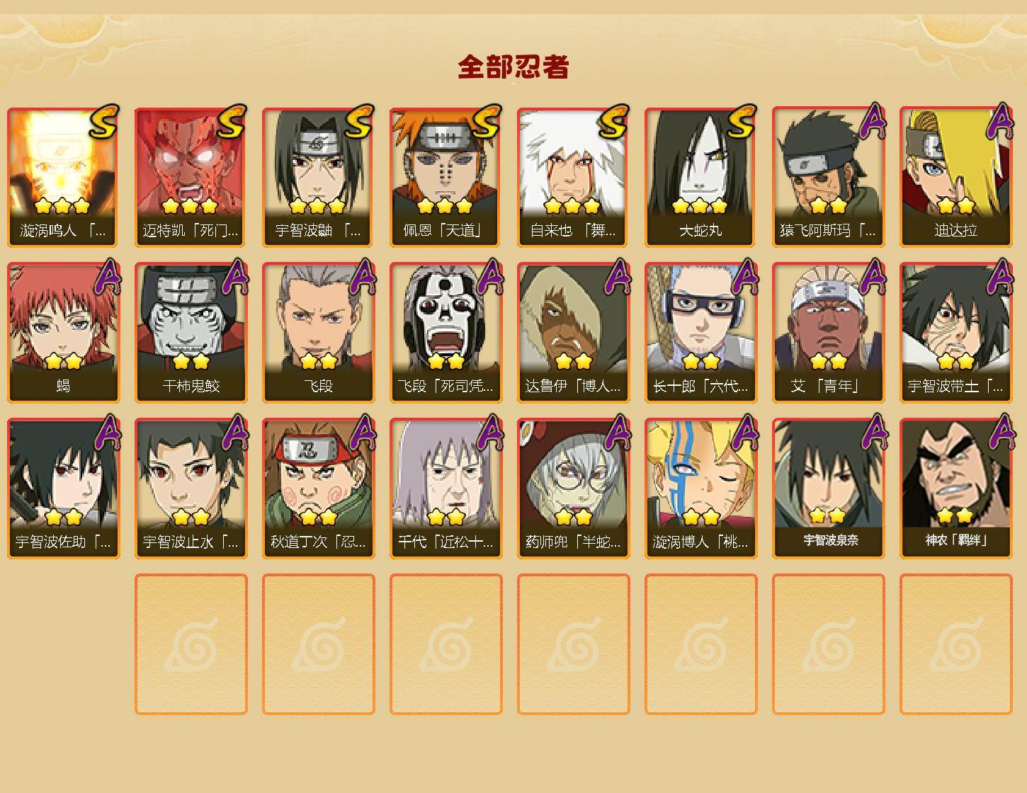 【HYYT320】V7/S忍6/A忍19/五代目雷影-达鲁伊/死司凭血-飞段/蝎/天道-佩恩/九喇嘛连结-漩涡鸣人/忍界大战-秋道丁次/秽土转生-猿飞阿斯玛/桃式显现-漩涡博人/六代目水影-长十郎/舞之豪杰-自来也/死门-迈特凯/暴怒-宇智波带土/半蛇斗篷-药师兜/飞段/2星神农「羁绊」/2星宇智波泉奈/新春限定-宇智波止水/迪达拉/干柿鬼鲛/大蛇丸/青年-艾/2星迈特凯「青春爆炸」/须佐能乎-宇智波佐助/近松十人卫-千代/须佐能乎-宇智波鼬