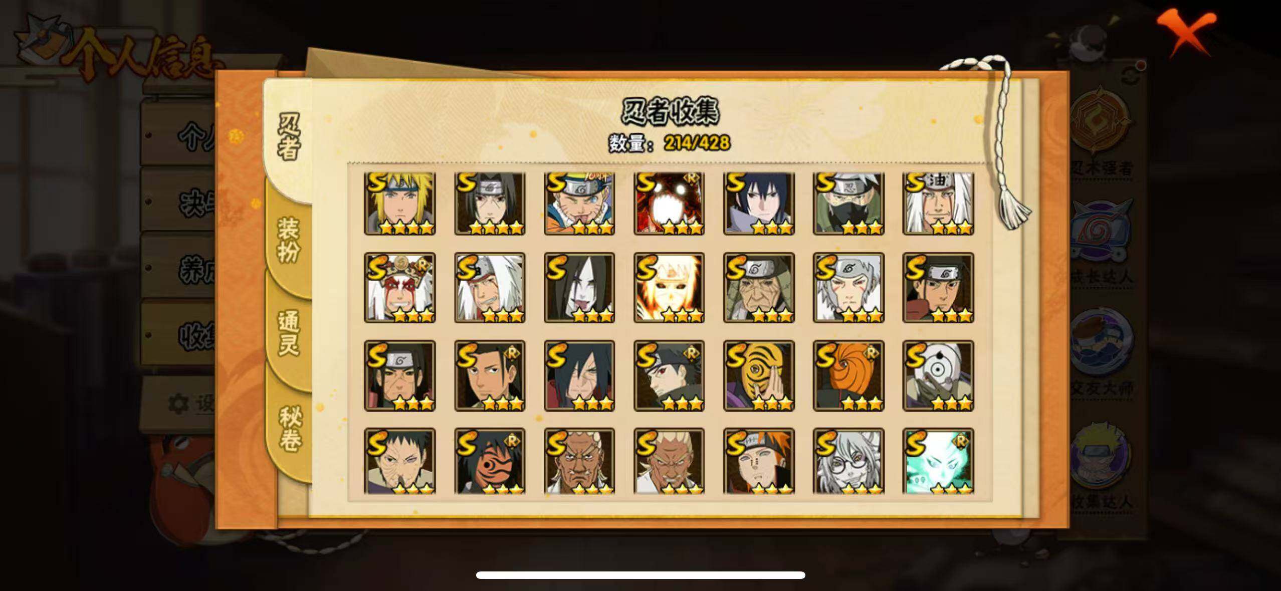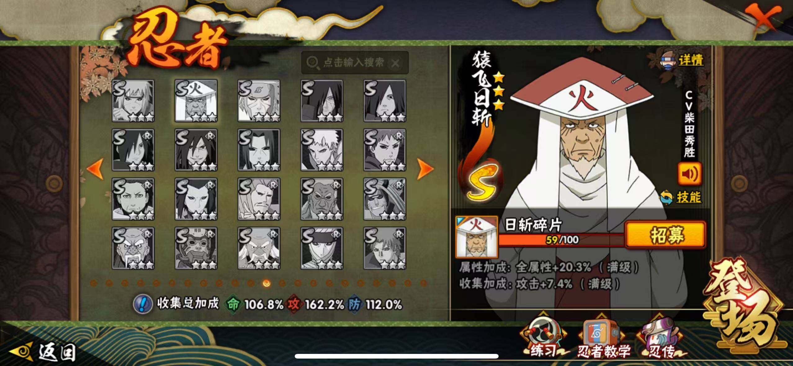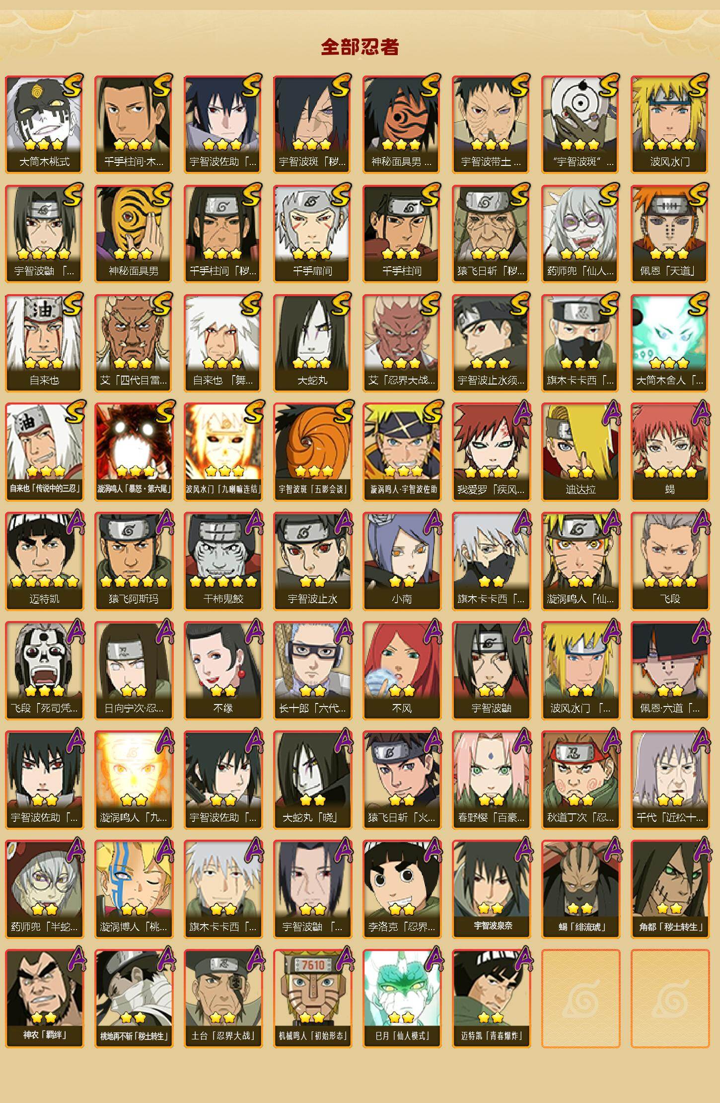 【S级忍者】:猿飞日斩「秽土转生」(3星),千手柱间「秽土转生」(3星),宇智波斑「秽土转生·解」(3星),宇智波带土「忍界大战」(3星),艾「忍界大战」(3星),宇智波鼬「须佐能乎」(4星),宇智波止水「须佐能乎」(3星),旗木卡卡西「须佐能乎」(3星),千手柱间「木叶创立」(3星),艾「四代目雷影」(3星),自来也(3星),自来也「舞之豪杰」(3星),大蛇丸(3星),自来也「传说中的三忍」(3星),千手柱间(3星),千手扉间(3星),波风水门(4星),药师兜「