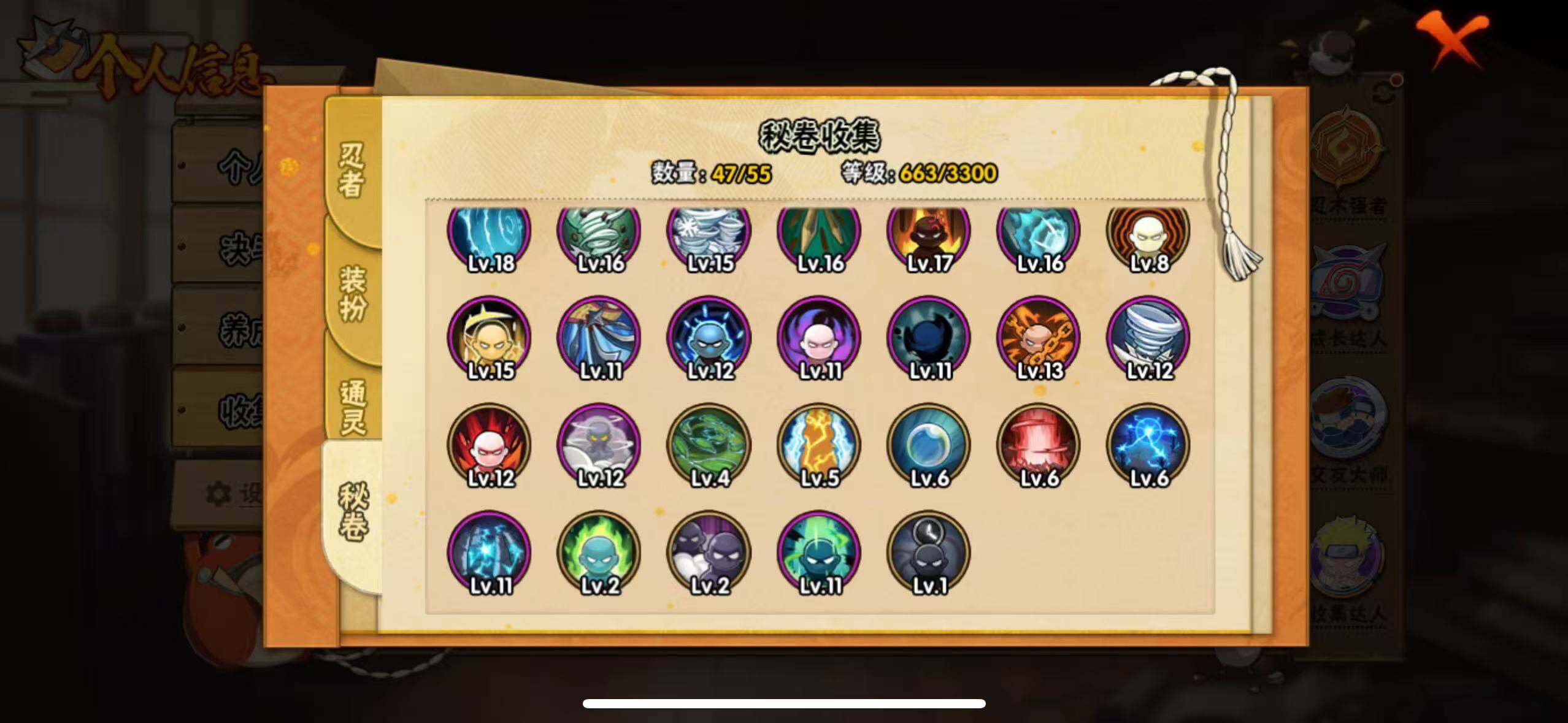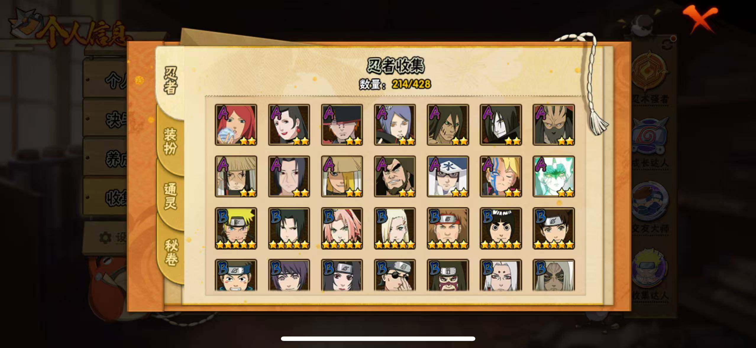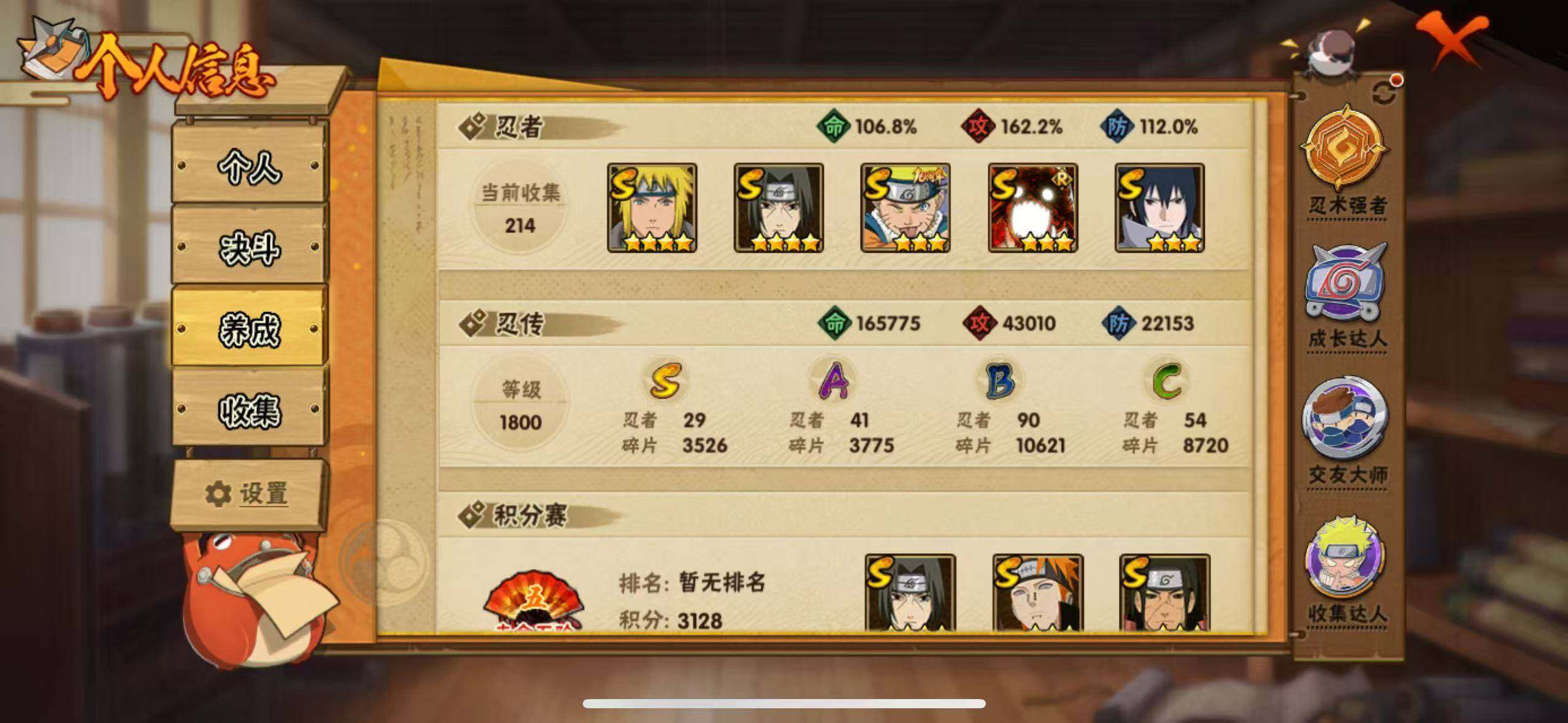 【S级忍者】:猿飞日斩「秽土转生」(3星),千手柱间「秽土转生」(3星),宇智波斑「秽土转生·解」(3星),宇智波带土「忍界大战」(3星),艾「忍界大战」(3星),宇智波鼬「须佐能乎」(4星),宇智波止水「须佐能乎」(3星),旗木卡卡西「须佐能乎」(3星),千手柱间「木叶创立」(3星),艾「四代目雷影」(3星),自来也(3星),自来也「舞之豪杰」(3星),大蛇丸(3星),自来也「传说中的三忍」(3星),千手柱间(3星),千手扉间(3星),波风水门(4星),药师兜「