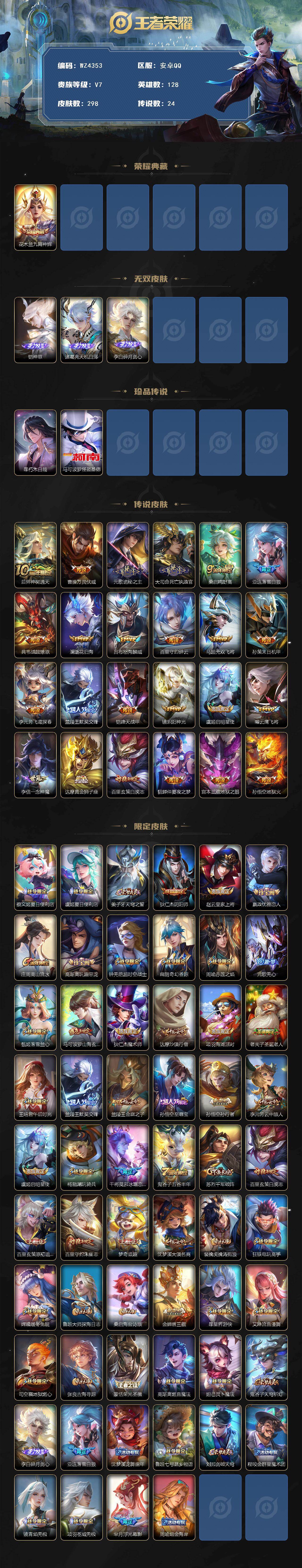 【WZ4353】贵族7/皮肤298/典藏1/传说24/史诗92/英雄128/孙权全皮/大司命全皮/金蝉全皮/花木兰-九霄神辉/铠神罪/诸葛亮天机白泽/李白-碎月剑心/暃朽木白哉/马可波罗-怪盗基德/后羿神树通天/曹操万灵伏威/元歌诡秘之主/大司命死亡执政官/桑启-鸣野蒿/亚连-落雪白狼/典韦-战鼓燎原/澜-逐花归海/吕布-怒海麟威/百里守约-碎云/马超-无双飞将/孙策-末日机甲/李元芳-飞鸢探春/兰陵王-默契交锋/铠-绛天战甲/镜-炽阳神光/虞姬-启明星使/曜-云鹰飞将/李信-一念神魔/达摩-黄