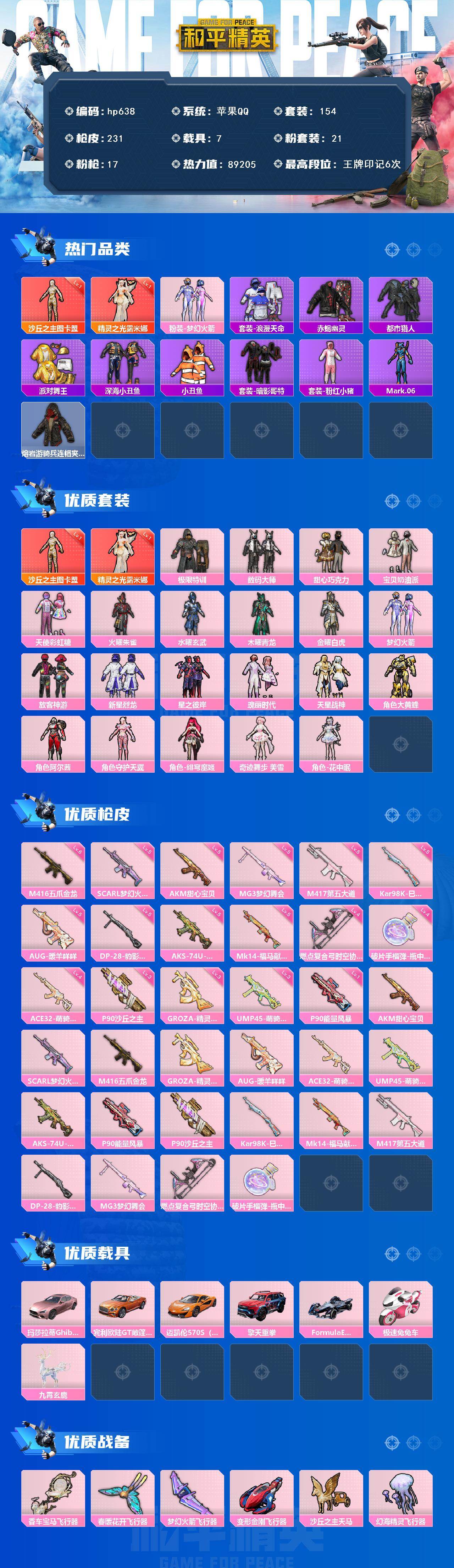 苹果 手Q-2神装-21粉装-17特效枪-7载具-10粉色飞行器-89205热力值-6王牌印记-154套装-231枪皮