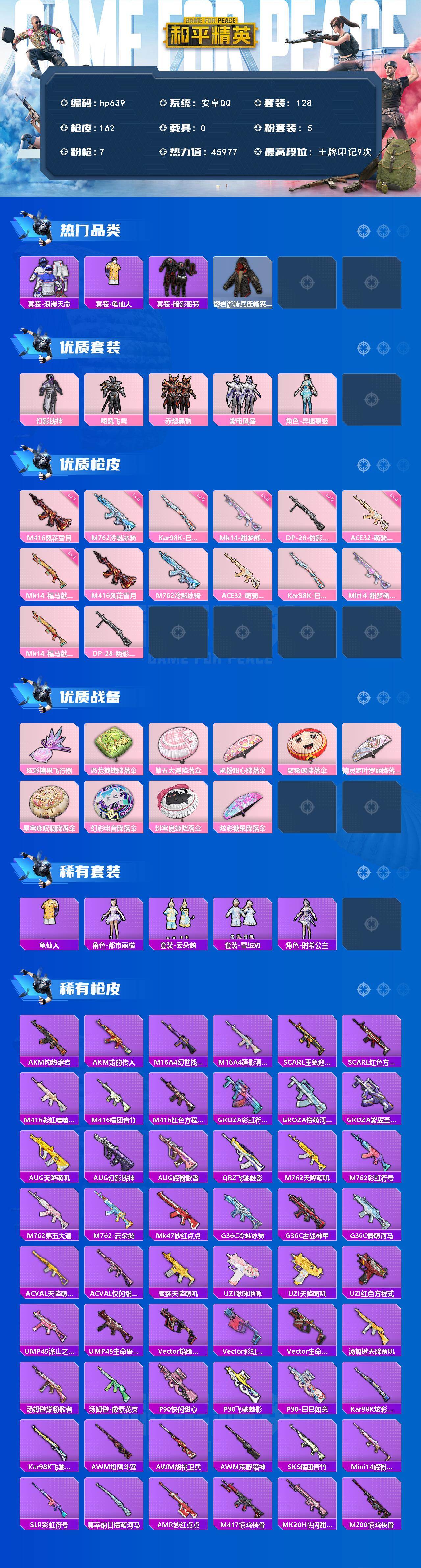 安卓 手Q-5粉装-7特效枪-0载具-1粉色飞行器-45977热力值-9王牌印记-128套装-162枪皮