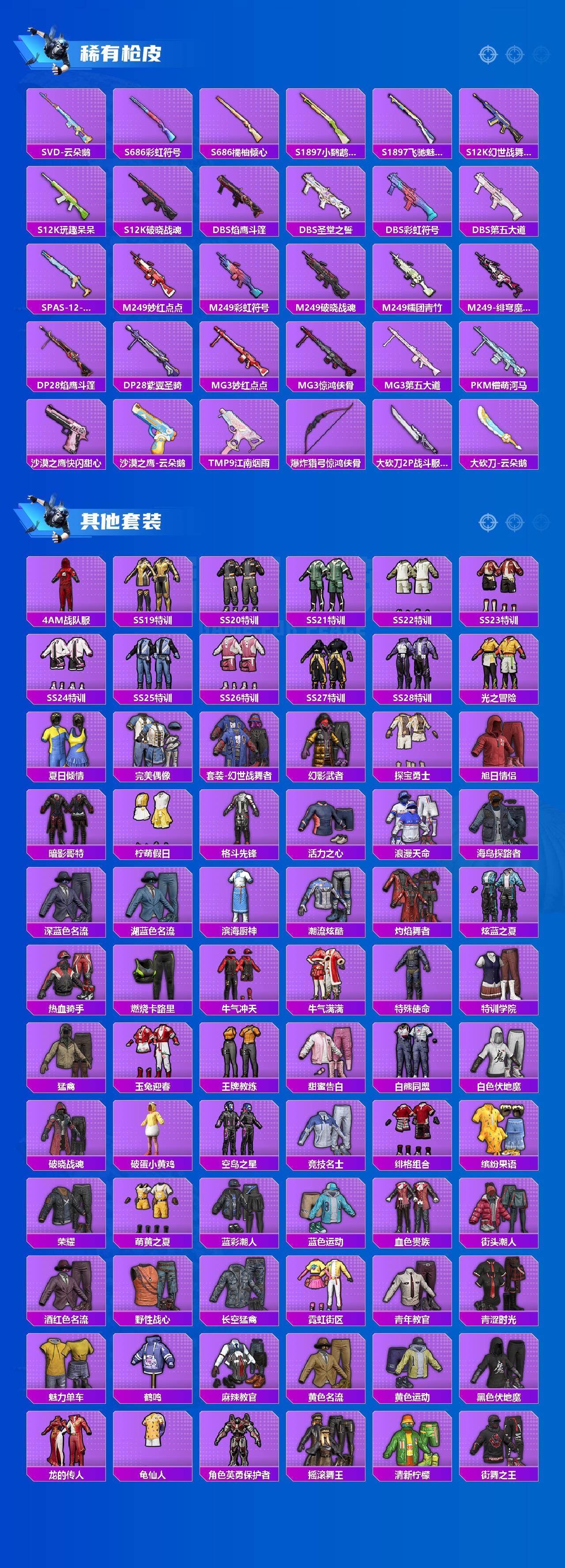 【粉色枪皮等级】:M416-风花雪月(七级),M762-冷魅冰骑(六级),ACE32-萌骑漫游(三级),Kar98K-巳巳如意(五级),Mk14-甜梦熊击(五级),Mk14-福马献瑞(一级),DP-28-豹影疾电(五级)