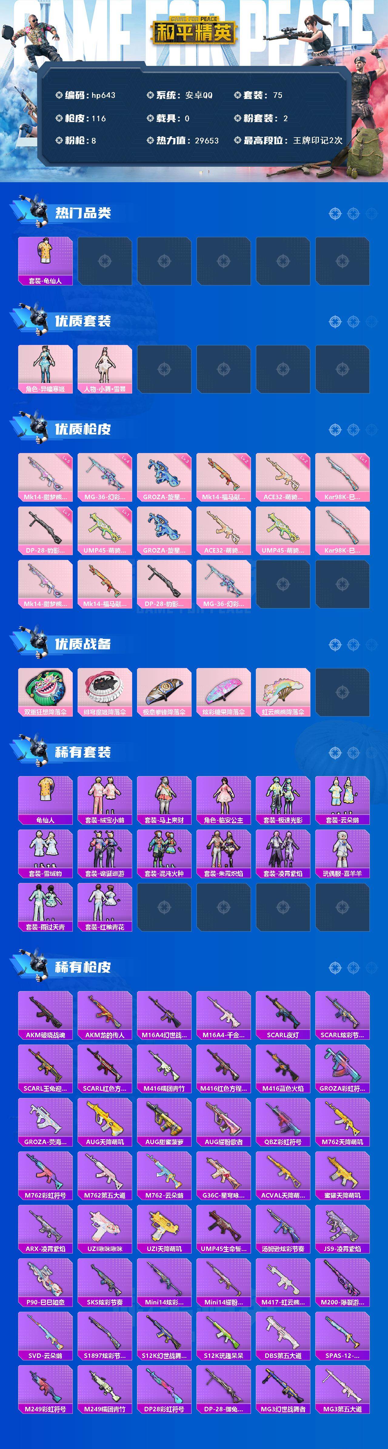 安卓 手Q-2粉装-8特效枪-0载具-0粉色飞行器-29653热力值-2王牌印记-75套装-116枪皮