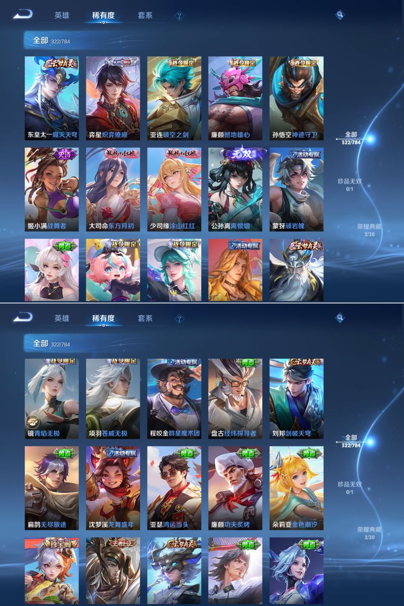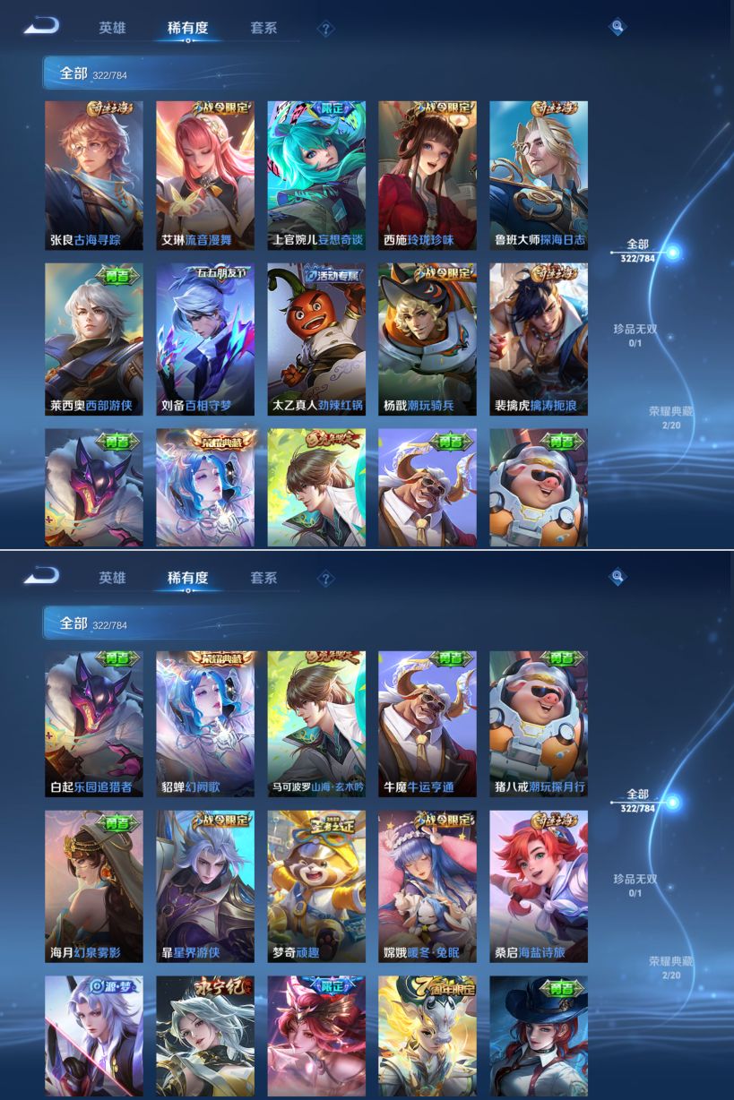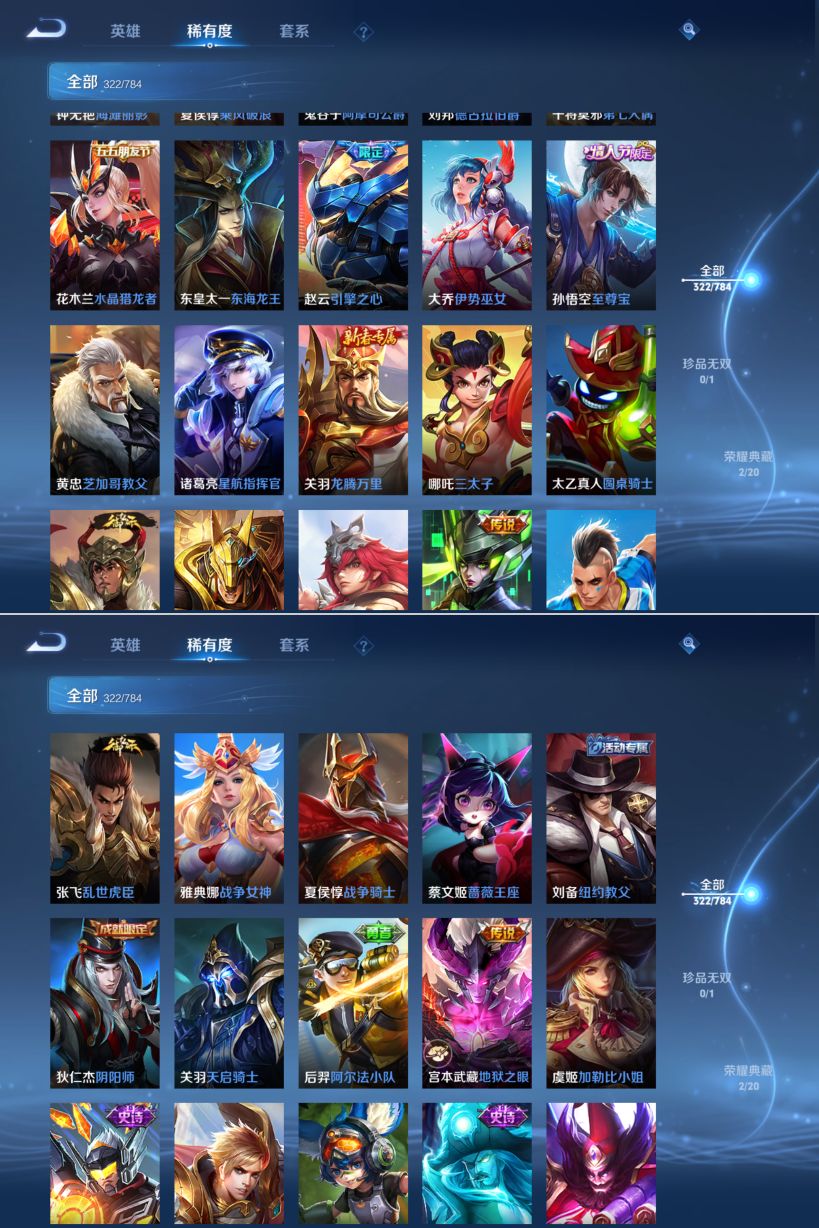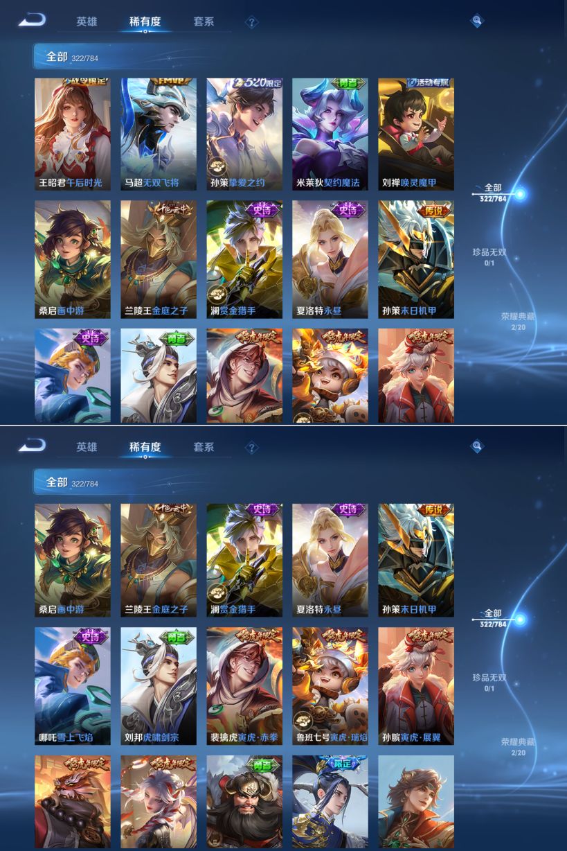 【传说皮肤】 神树通天 妄想奇谈 幻光神枪 愿照·九州拓 绯月行 无双飞将 挚爱之约 仲夏夜之梦 遇见胡旋 久胜战神 地狱之眼 黄金射手座 炽阳神光 时之恋人 寅虎·瑞焰 寅虎·赤拳 末日机甲 末日机甲 异界灵契 游龙清影 李逍遥 启明星使 武陵仙君