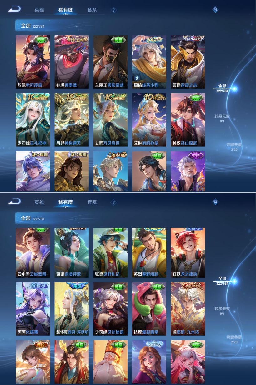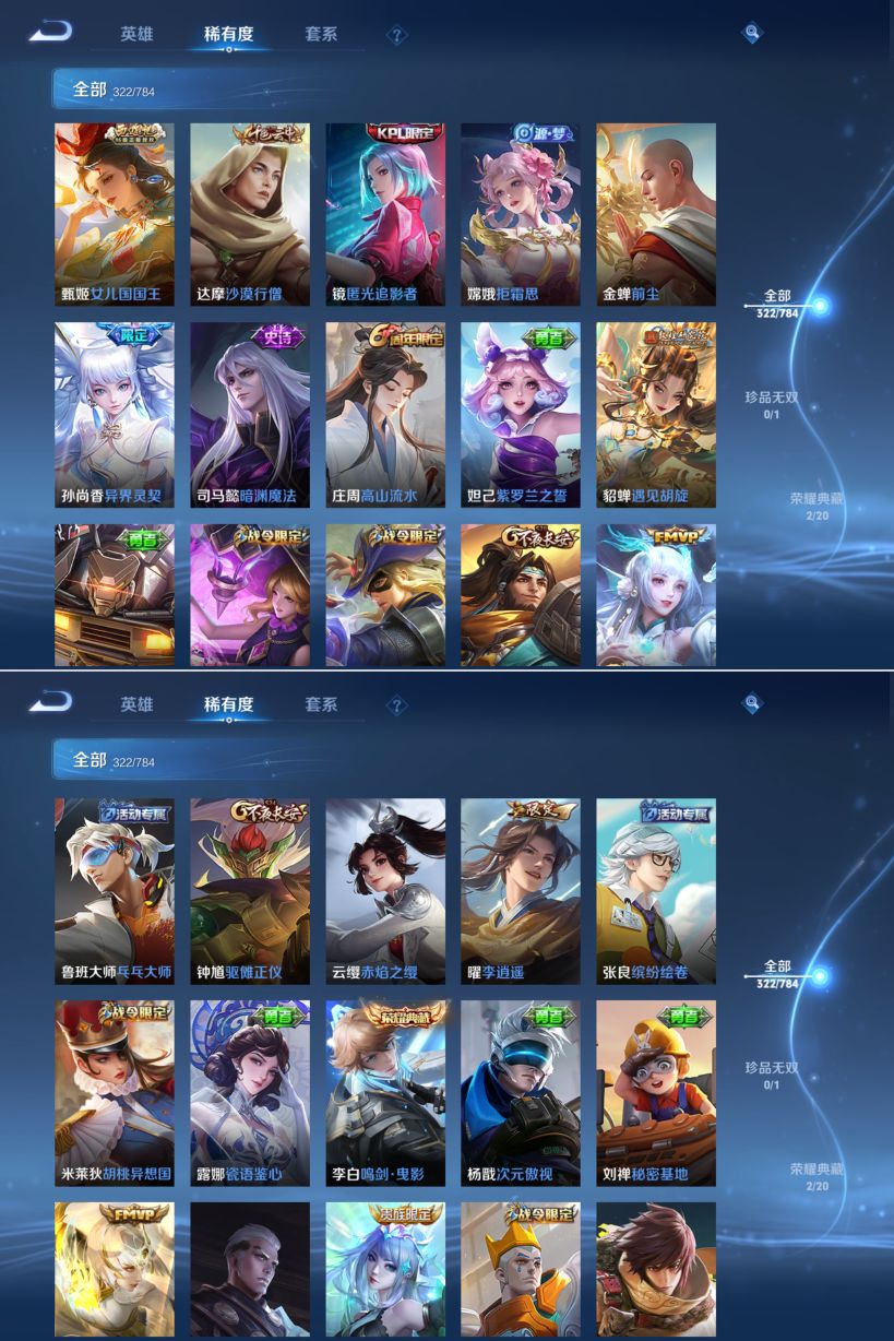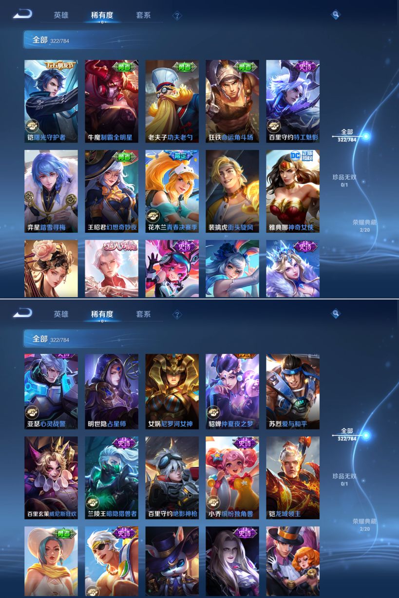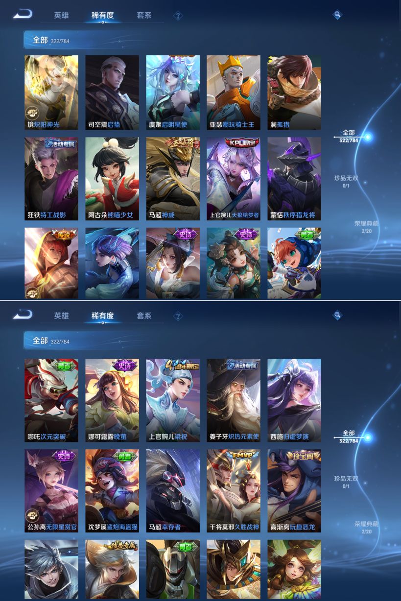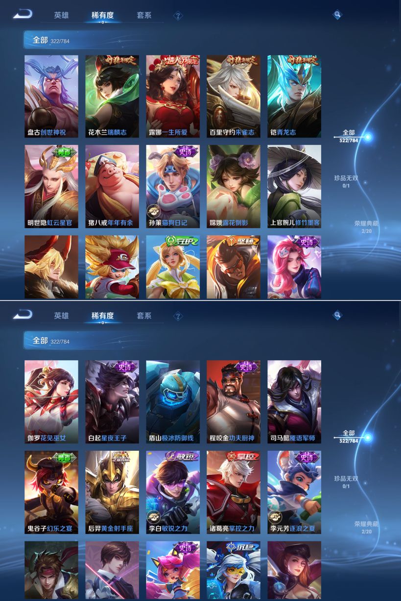 【传说皮肤】 神树通天 妄想奇谈 幻光神枪 愿照·九州拓 绯月行 无双飞将 挚爱之约 仲夏夜之梦 遇见胡旋 久胜战神 地狱之眼 黄金射手座 炽阳神光 时之恋人 寅虎·瑞焰 寅虎·赤拳 末日机甲 末日机甲 异界灵契 游龙清影 李逍遥 启明星使 武陵仙君
