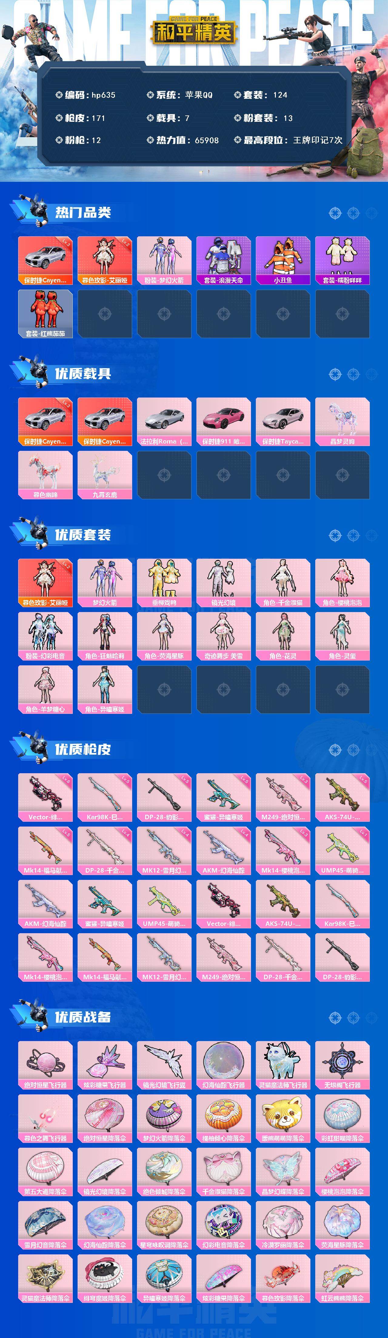 苹果 手Q-1神装-13粉装-12特效枪-7载具-7粉色飞行器-65908热力值-7王牌印记-124套装-171枪皮