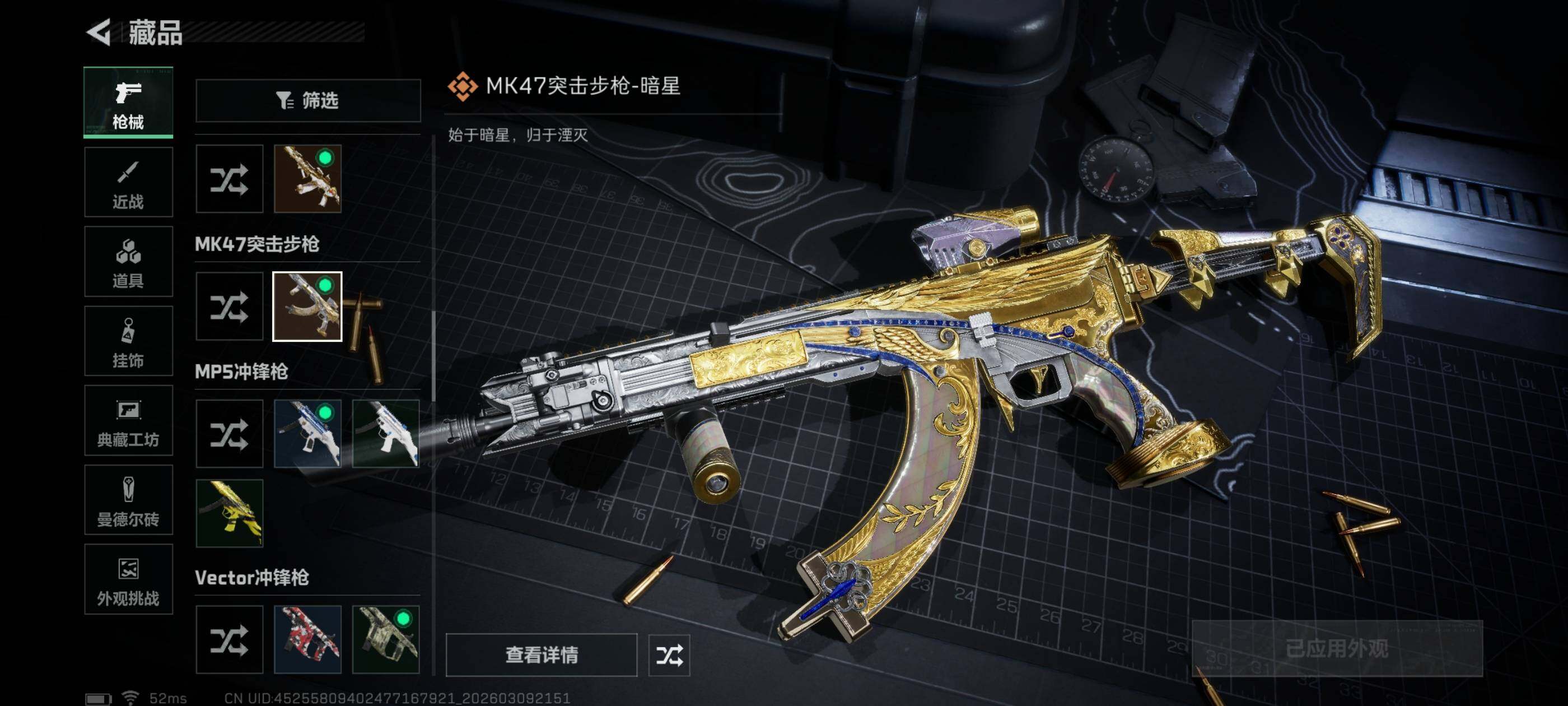 【传说外观】:腾龙突击步枪-万金泪冠,MK47突击步枪-暗星,SR-3M紧凑突击步枪-暗星,勇士冲锋枪-万金泪冠,AWM狙击步枪-万金泪冠