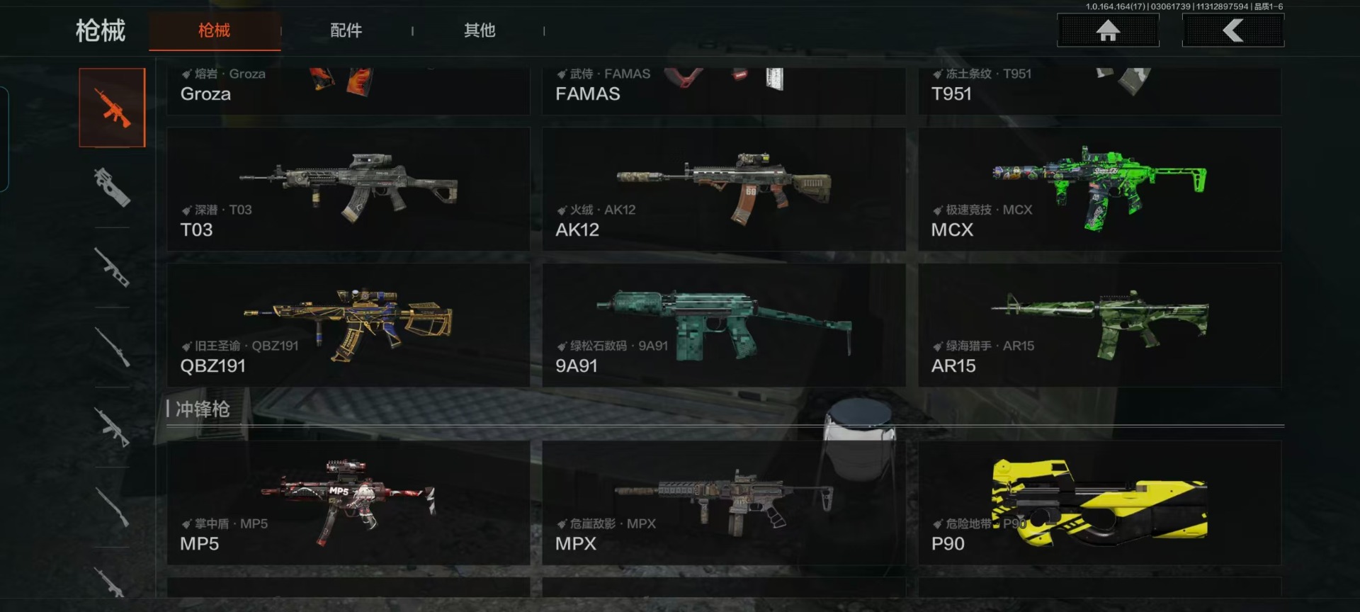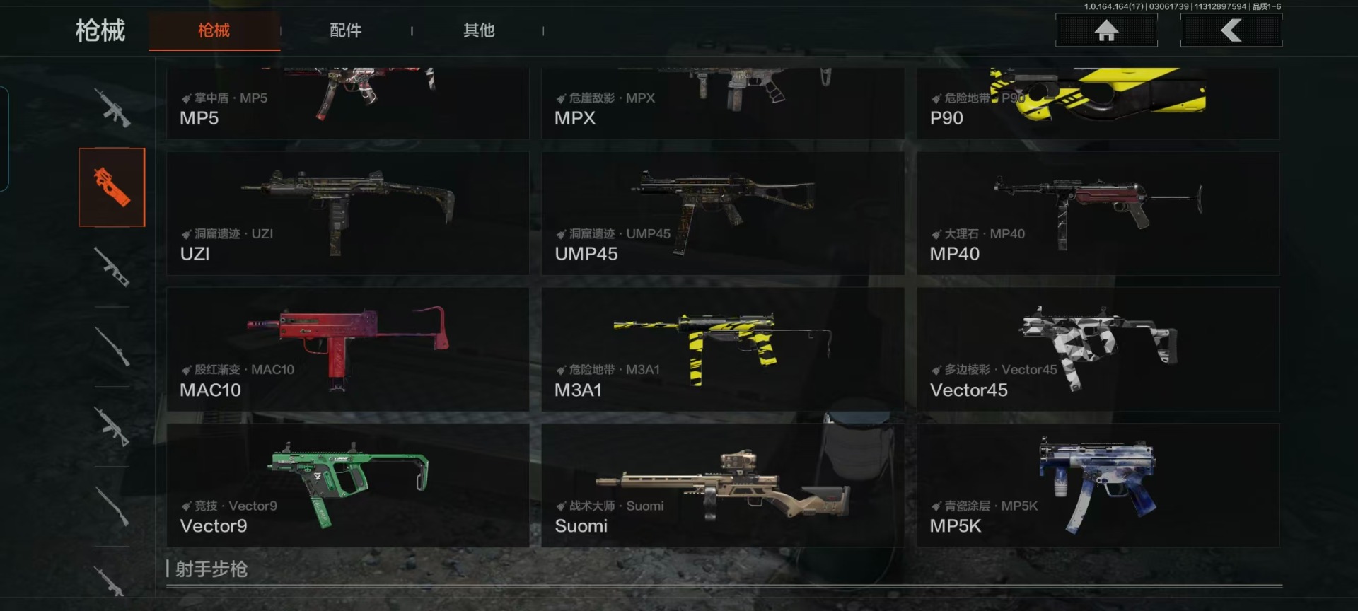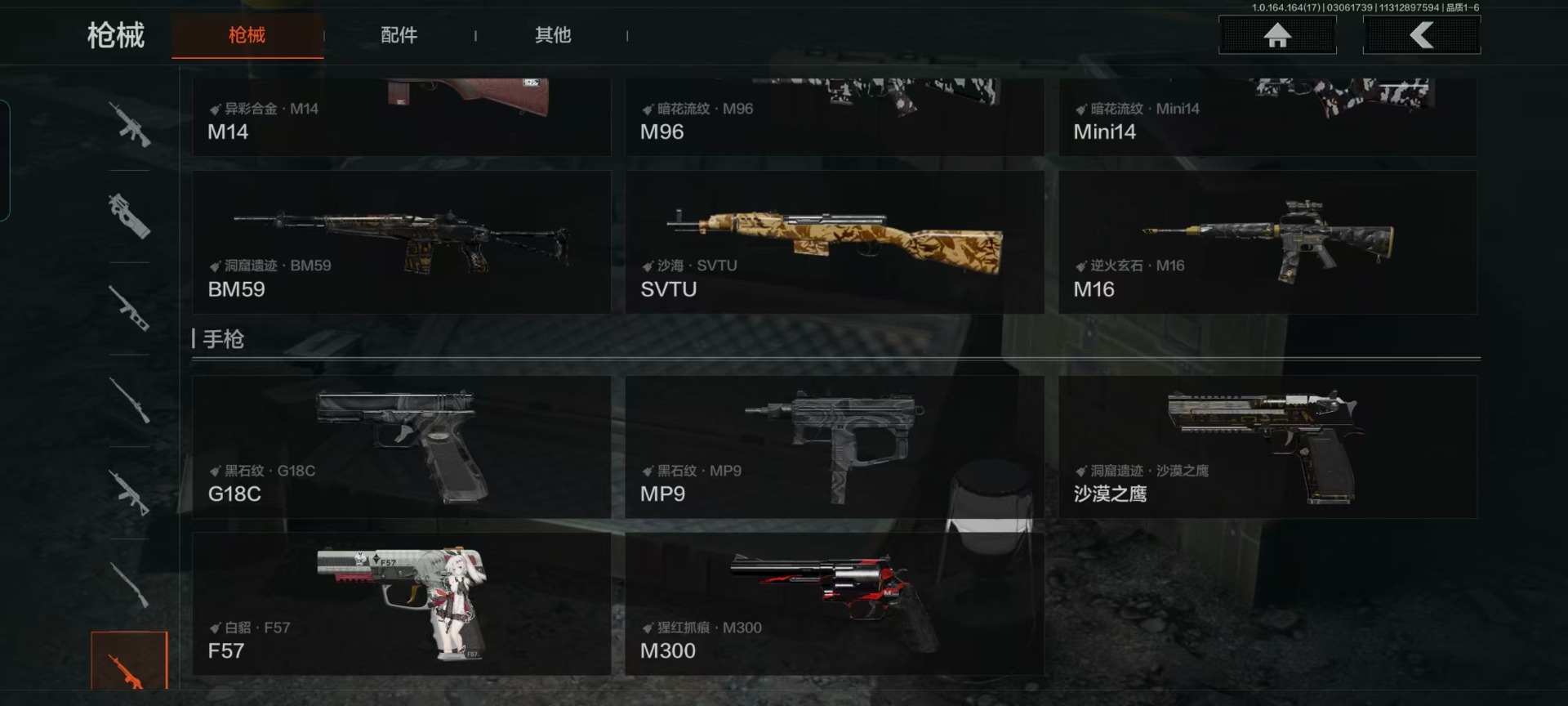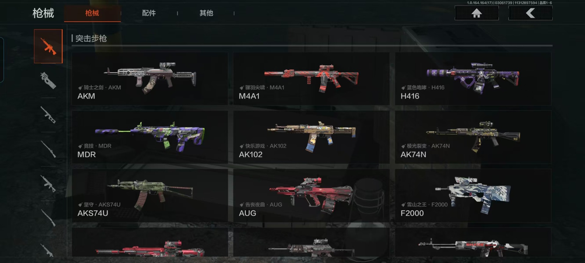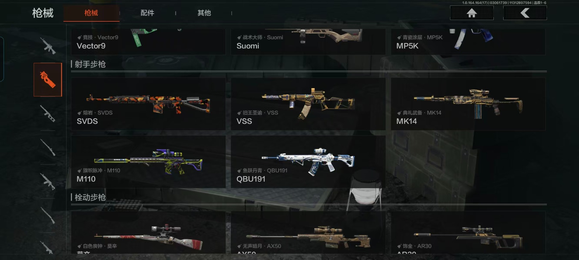 【紫色枪皮】鱼跃丹青·QBU191,逆火玄石·M16,秘域鎏金·RPK16,典礼武备·MK14,竞技·MDR,战术大师·Suomi,旗帜脉冲·M110,骑士之剑·AKM,饰金·AR30,危崖敌影·MPX,阴影·AN94,白色丧钟·莫辛,白貂·F57,掌中盾·M