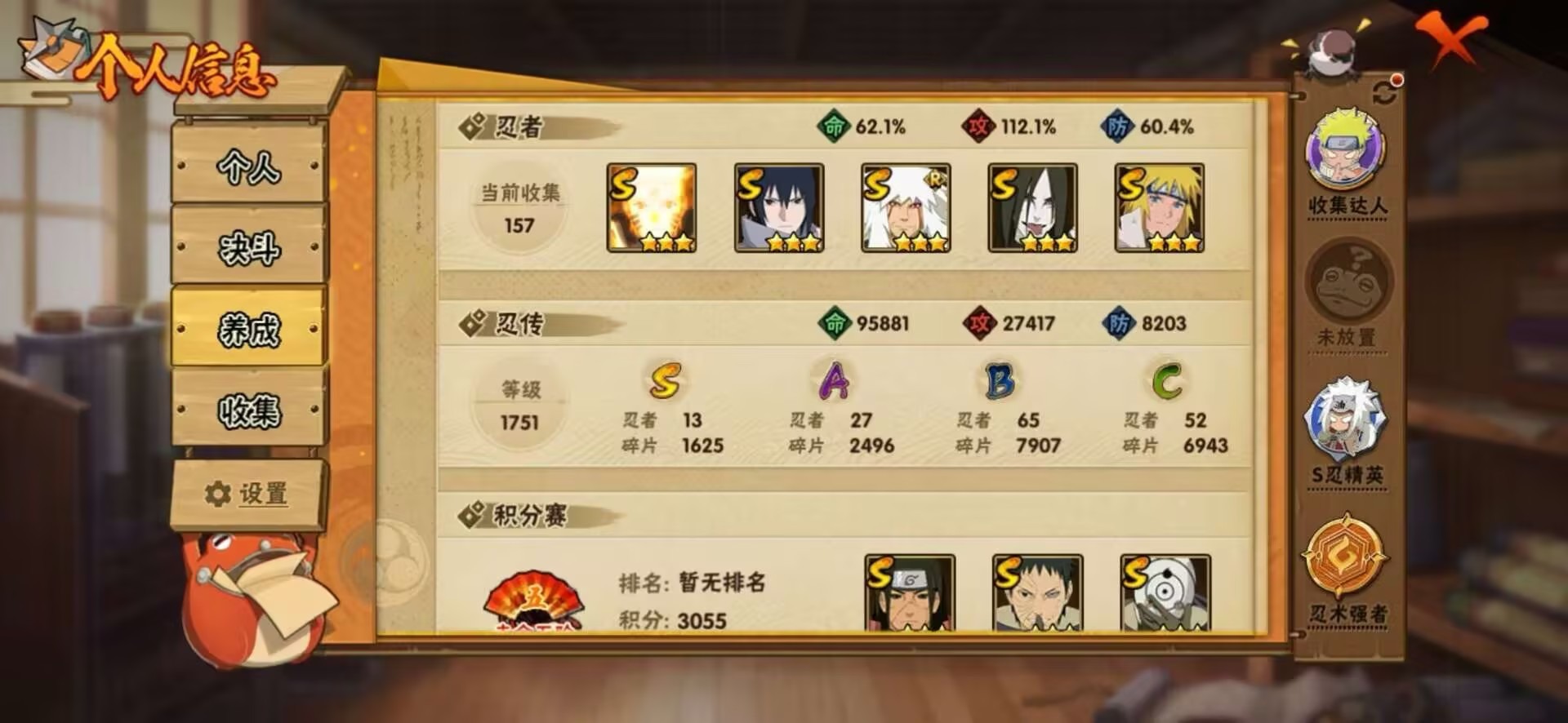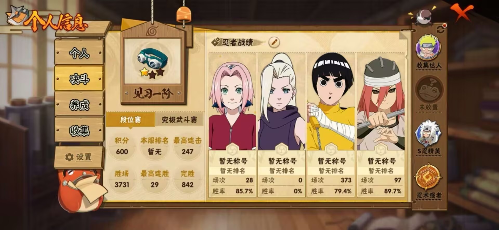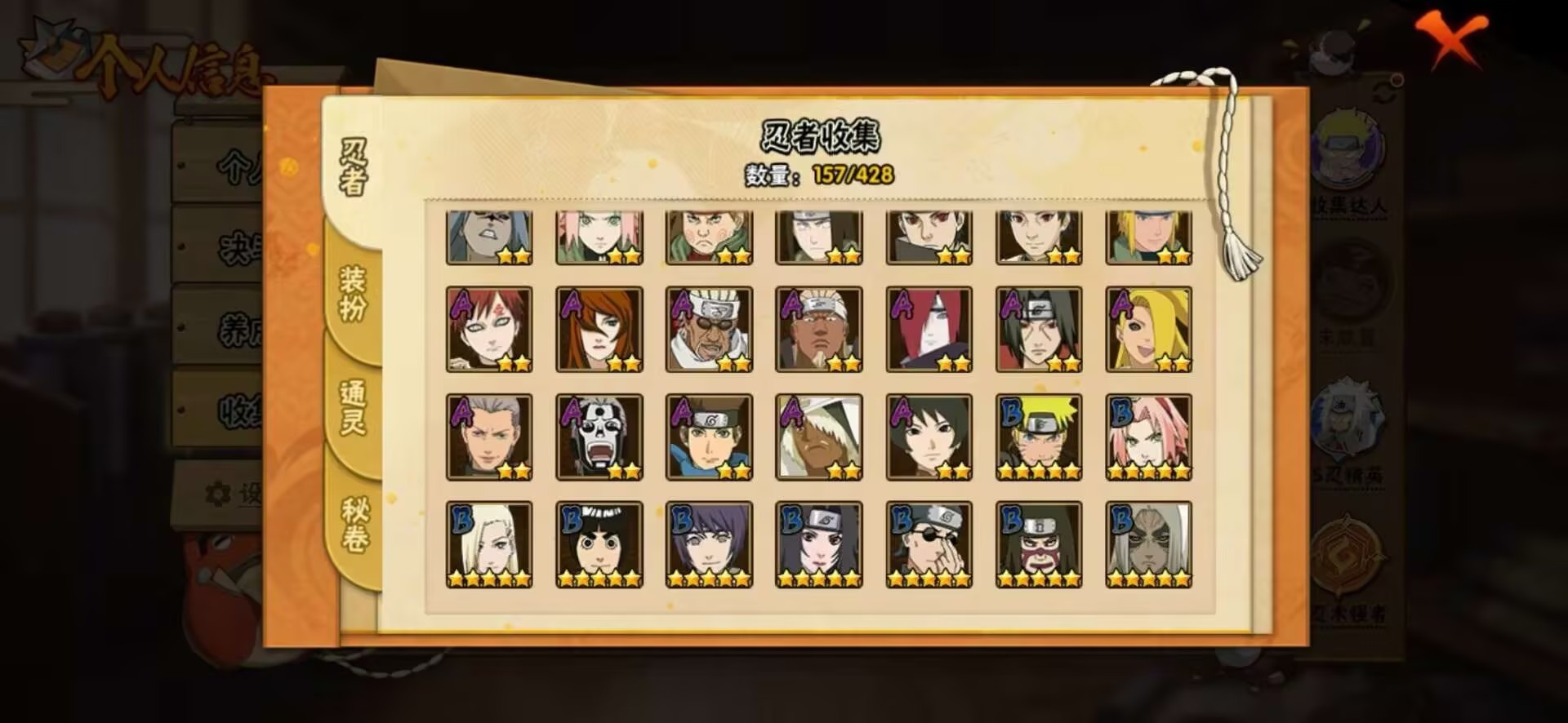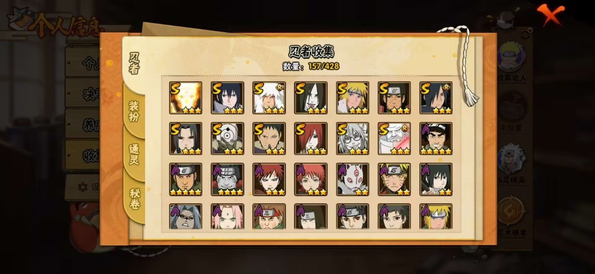 【S级忍者】宇智波佐助「永恒万花筒」,大筒木金式「博人传」,宇智波斑 「木叶创立」,宇智波带土 「忍界大战」,千手柱间「秽土转生」,漩涡鸣人·宇智波佐助,宇智波鼬「秽土转生」,药师兜「仙人模式」,宇智波斑「白面具」,长门「秽土转生」,波风水门,大蛇丸,自来也